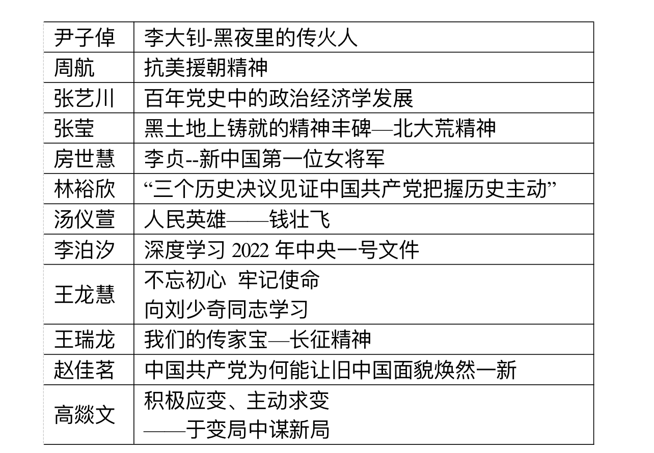 尹子倬、房世慧、汤仪萱、王龙慧以民族英雄为题,通过讲述党史故事,重温革命先烈的丰功伟绩,厚植爱党、爱国、爱社会主义的情感,真正做到学史明理、学史增信、学史崇德、学史力行,让红色基因、革命薪火代代传承;周航、张莹、王瑞龙、赵佳茗以革命精神为引,带领支部党员一起重走百年建党路,号召青年学子弘扬光荣传统、赓续红色血脉,身体力行把伟大建党精神继承下去,发扬光大;张艺川、林裕欣、李泊汐、高燚文将党史与专业相结合,透过对重要历史事件和重要文件精神的解析,加深对党的历史、理论政策的理解和认识,让理想信念在灵魂深处扎根。