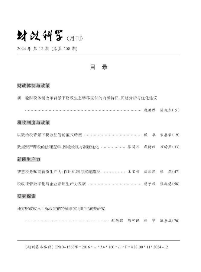 近期,我院赵德昭教授与其合作者的最新研究成果《地方财政收入目标设定的特征事实与时空演变研究》在《财政科学》2024年第12期正式发表。《财政科学》系中华人民共和国财政部主管、中国财政科学研究院主办的经济类综合型学术期刊,侧重于“策论”研究的智库类学术期刊,遵循“贴近现实,贴近地方,贴近决策”的办刊宗旨,紧扣中国财经改革实践,以“大财政学”的视野打造中国财政政策研究的前沿阵地。