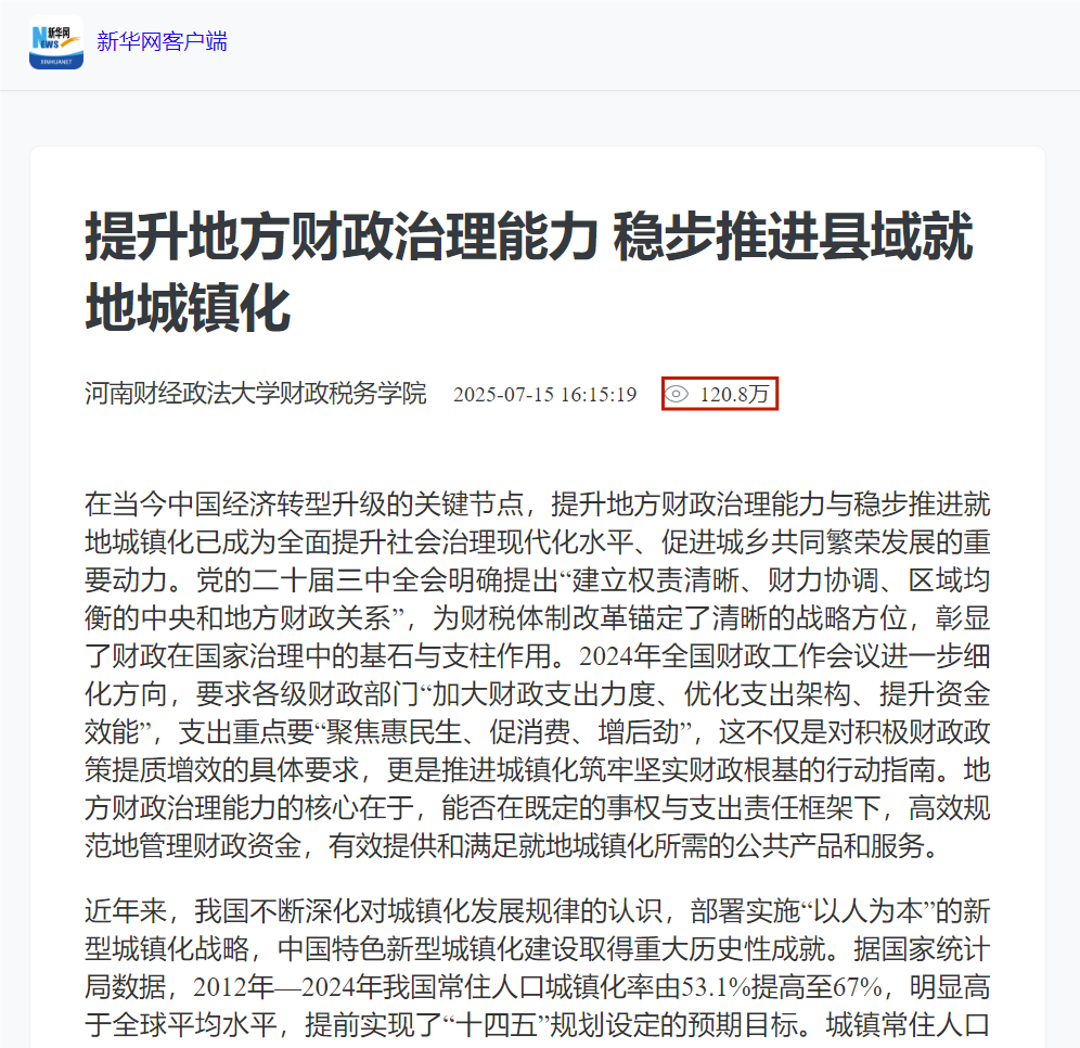 近期,我院赵德昭教授与其合作者的最新理论文章《提升地方财政治理能力稳步推进县域就地城镇化》在2025年7月15日于中央权威媒体新华网正式刊发,文章发布6小时内突破一百万阅读量。新华网是国家通讯社新华社主办的中央重点门户网站和互联网全球传播与服务平台,是中国最具影响力的网络媒体和具有全球影响力的中文网站。作为新华社全媒体新闻信息产品的主要传播平台,拥有31个地方频道以及英、法、西、俄、阿、日、韩、德、葡等多种语言频道,重大新闻首发率和转载率遥遥领先国内其他网络媒体。新华网是全球网民了解中国的最重要窗口,致力于为全球网民提供最权威最及时的新闻信息服务,用户遍及200多个国家和地区。