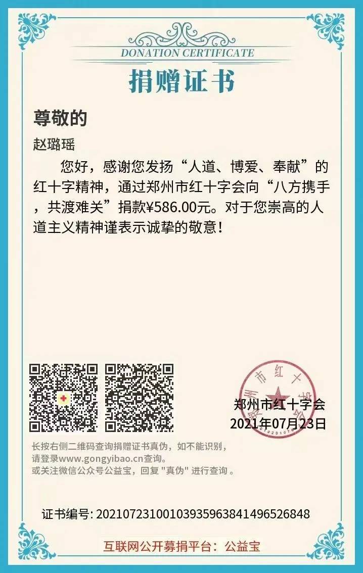 7月20日下午,一场罕见的暴雨突然袭击河南省,连续三天的极值降水,致使williamhill英国研究生赵璐瑶的家乡受损严重,只能暂时转移至安全地区。水火无情,但人有情,7月23日,赵璐瑶向郑州市红十字会捐款,以个人行动诠释着“人道、博爱、奉献”的精神,她只希望家乡能快一点、再快一点恢复如初,人民能吃喝不愁,有家可归。