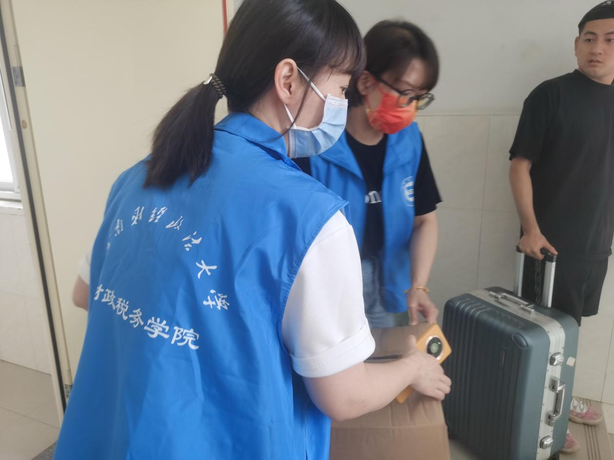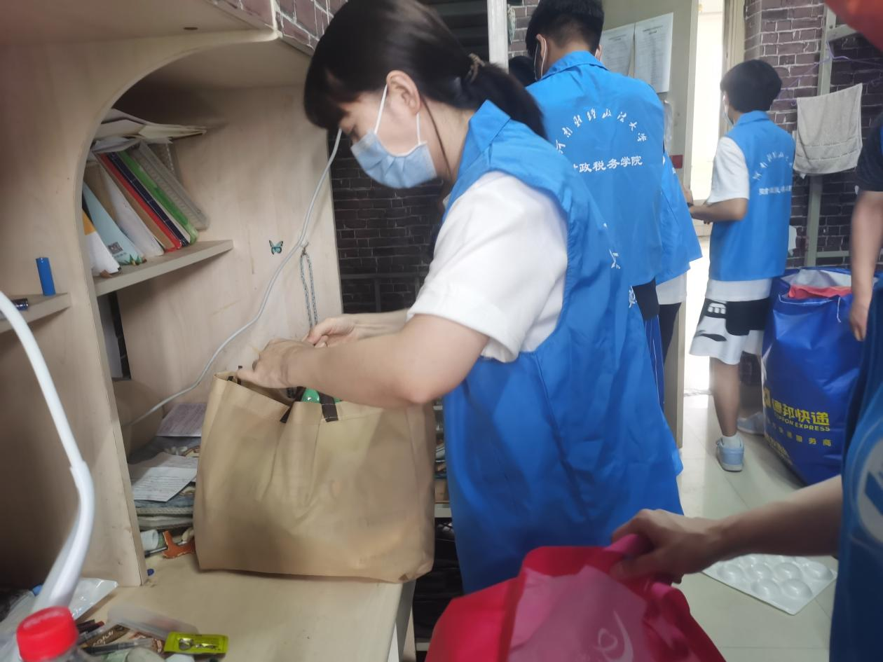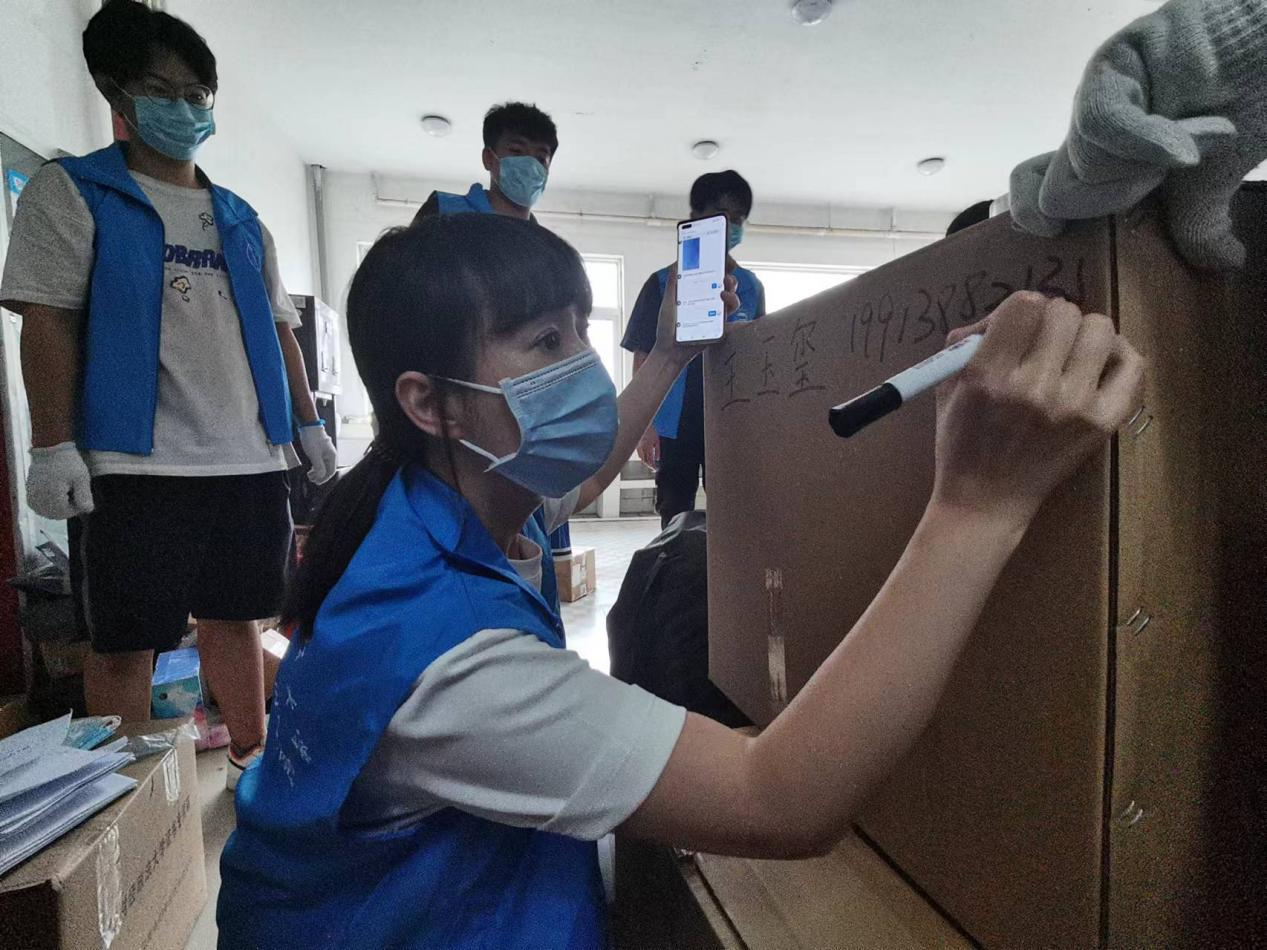 打包完成后,大家还细心地在行李上写上了学生的姓名和住址,避免在运送的过程中出现差错。宿舍内空间较为狭小,天气较为炎热,行李打包起来也格外费时费力,不一会老师们已经汗流浃背了,但工作起来仍然干劲十足,毫无怨言。