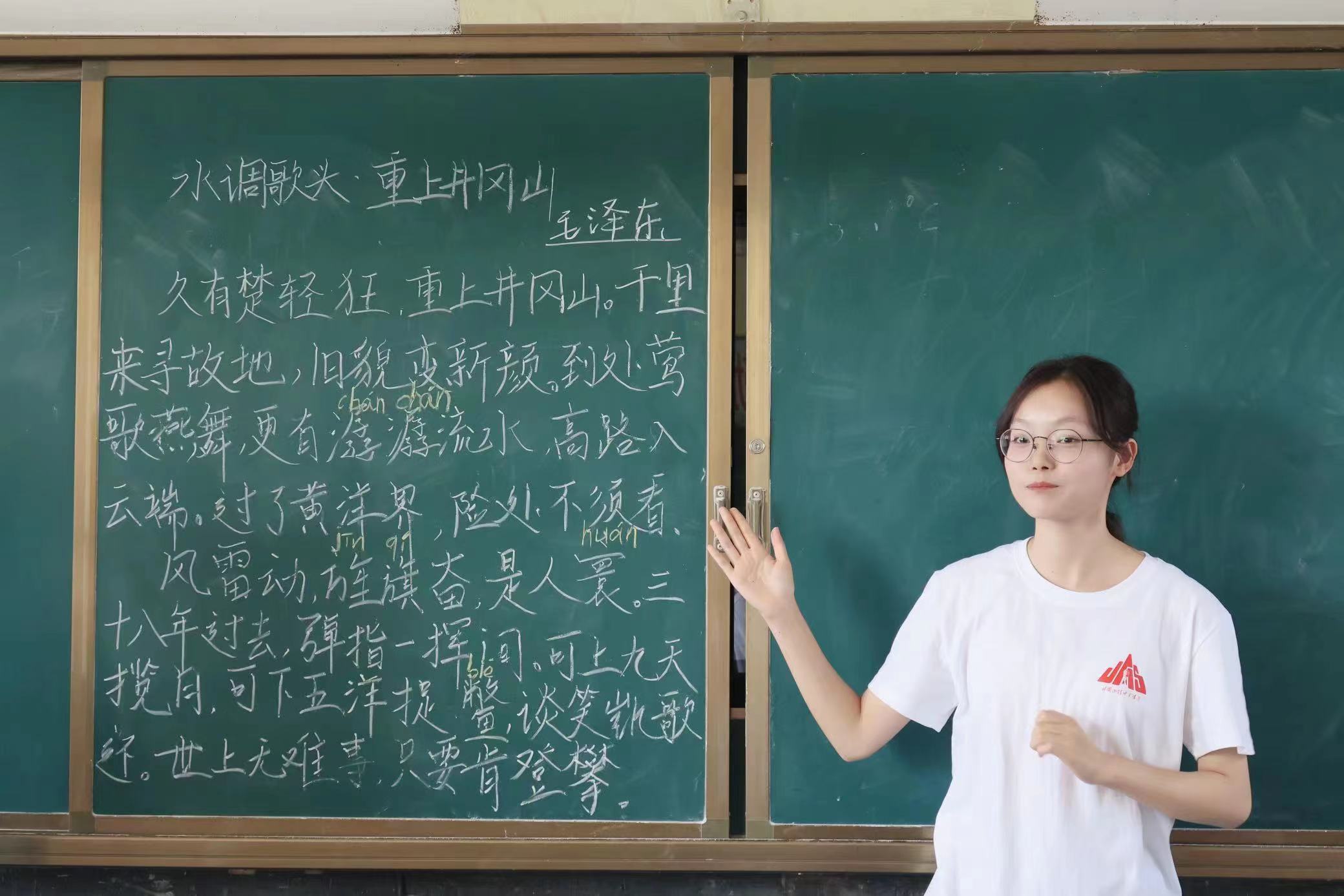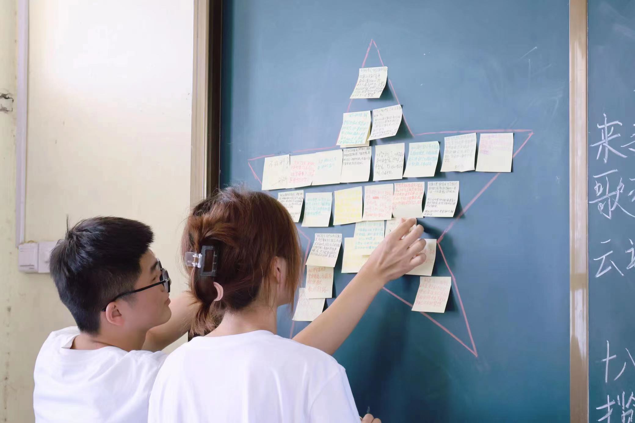 宣讲的开篇,宣讲团成员以毛泽东同志的诗词《水调歌头·重上井冈山》切入主题,通过朗诵、讨论、互动问答以及诗词解读等方式,追寻历史的脚步,穿越时光的长河,将同学们带入井冈山这片红色圣地。在这片热土上,英勇的革命先烈们锻造出坚不可摧的革命意志,他们身穿戎装,步履坚定,为了民族独立和人民解放,背负起沉重的历史责任。随后,宣讲团成员通过一幅幅图片向同学们展示那段历史,讲述一块石头、一根灯芯、一面镜子背后悲壮、沉重又感人的难忘故事。无数先辈们高举着红旗,义无反顾地投身于革命的浪潮中,用鲜血和热泪书写着英勇的传奇。在炮火的洗礼中,井冈山精神如同火种一般在他们心中熊熊燃烧,也照亮了前行的道路,终凝练成铿锵有力的二十四个字:坚定信念、艰苦奋斗、实事求是、敢闯新路、依靠群众、勇于胜利。在宣讲团成员的引导下,同学们积极表达了自己对这二十四个字的理解,井冈山精神正如一首嘹亮的赞歌回荡在空中,唤起了同学们内心深处的共鸣,他们满怀信仰和理想,眼神中透出坚定的热情。最后,实践团成员和同学们一起在心愿卡上写下今日的所感所想,贴在黑板上,汇聚成五星图案,并再次齐诵诗词结束了今天的“井冈山之旅”。
