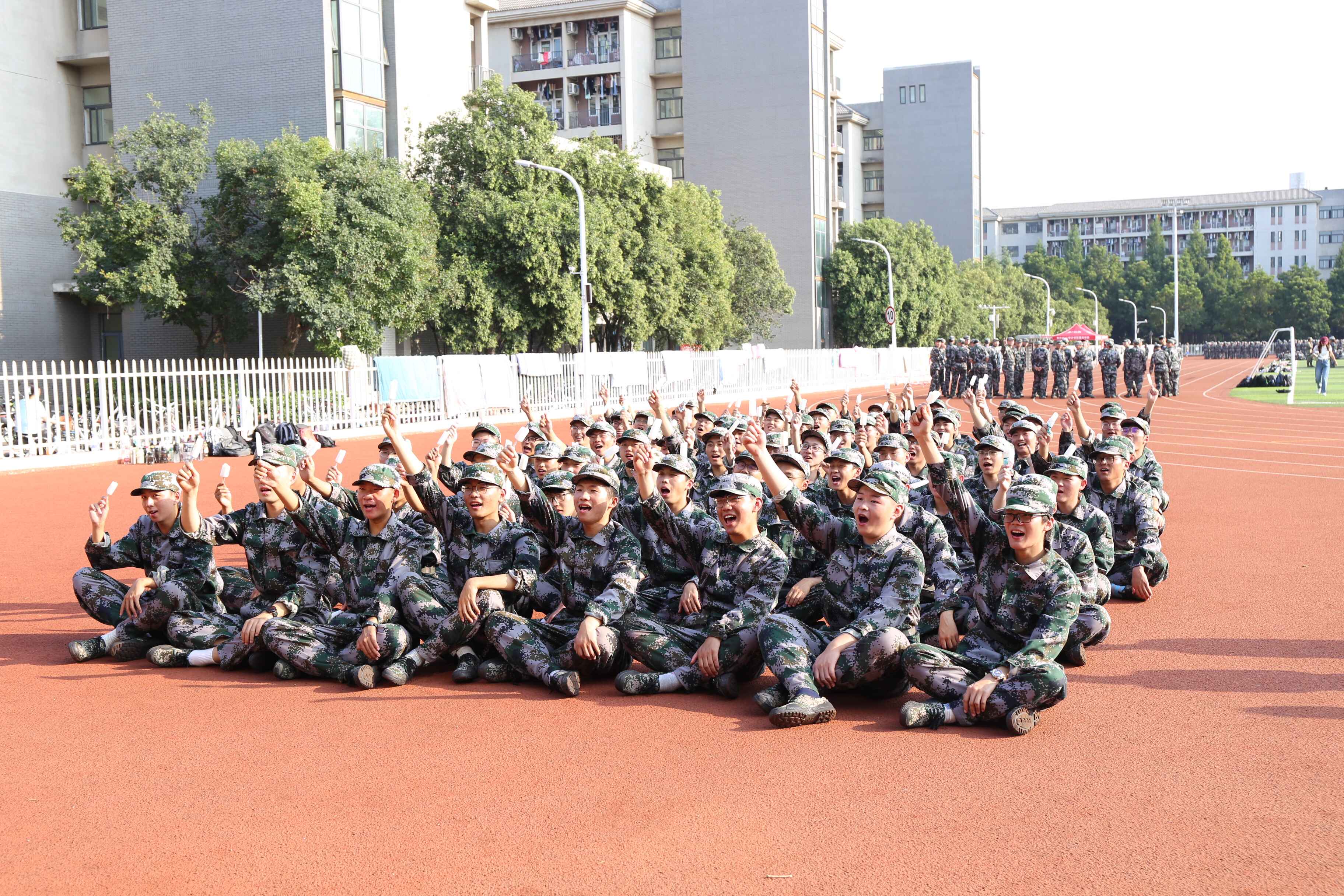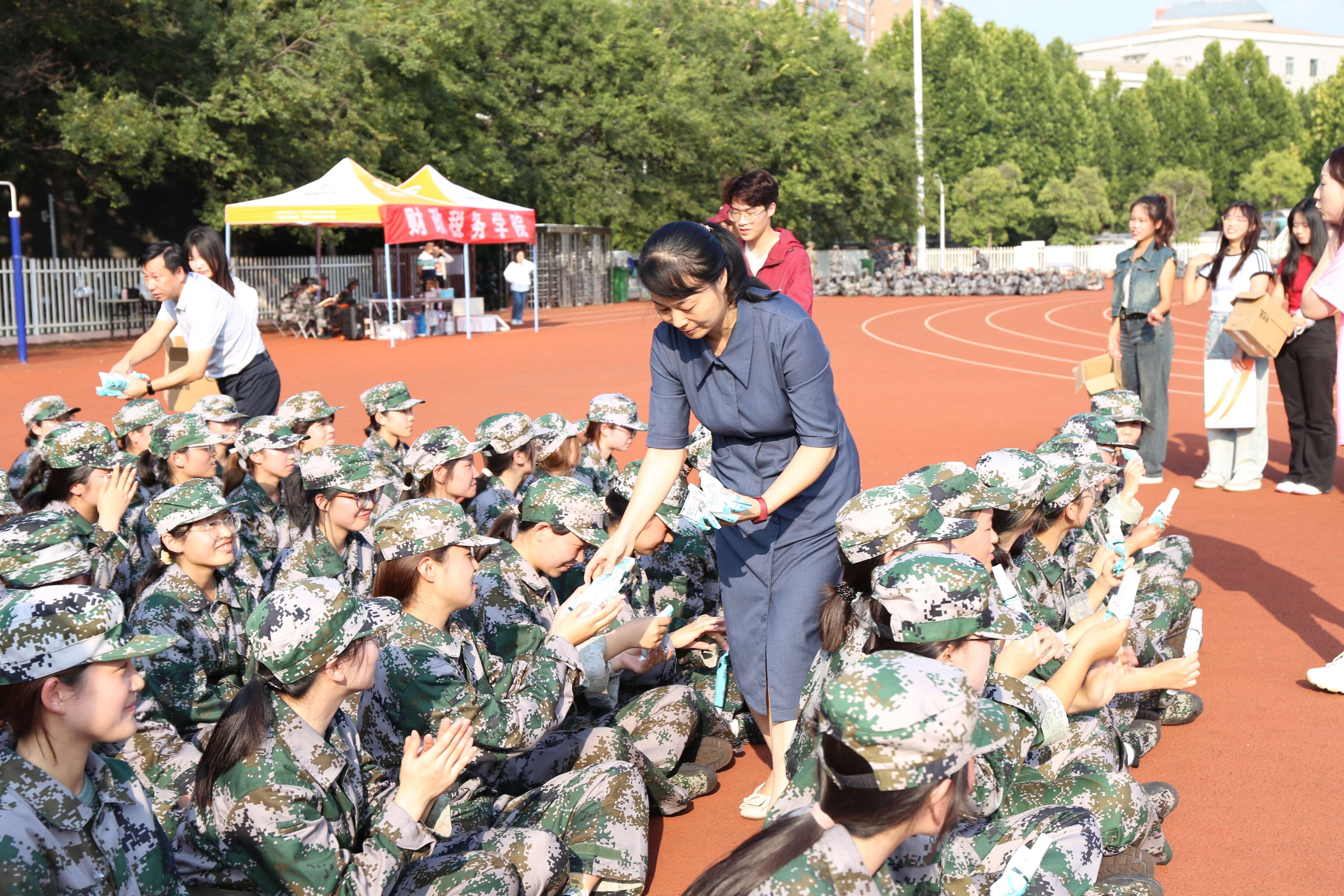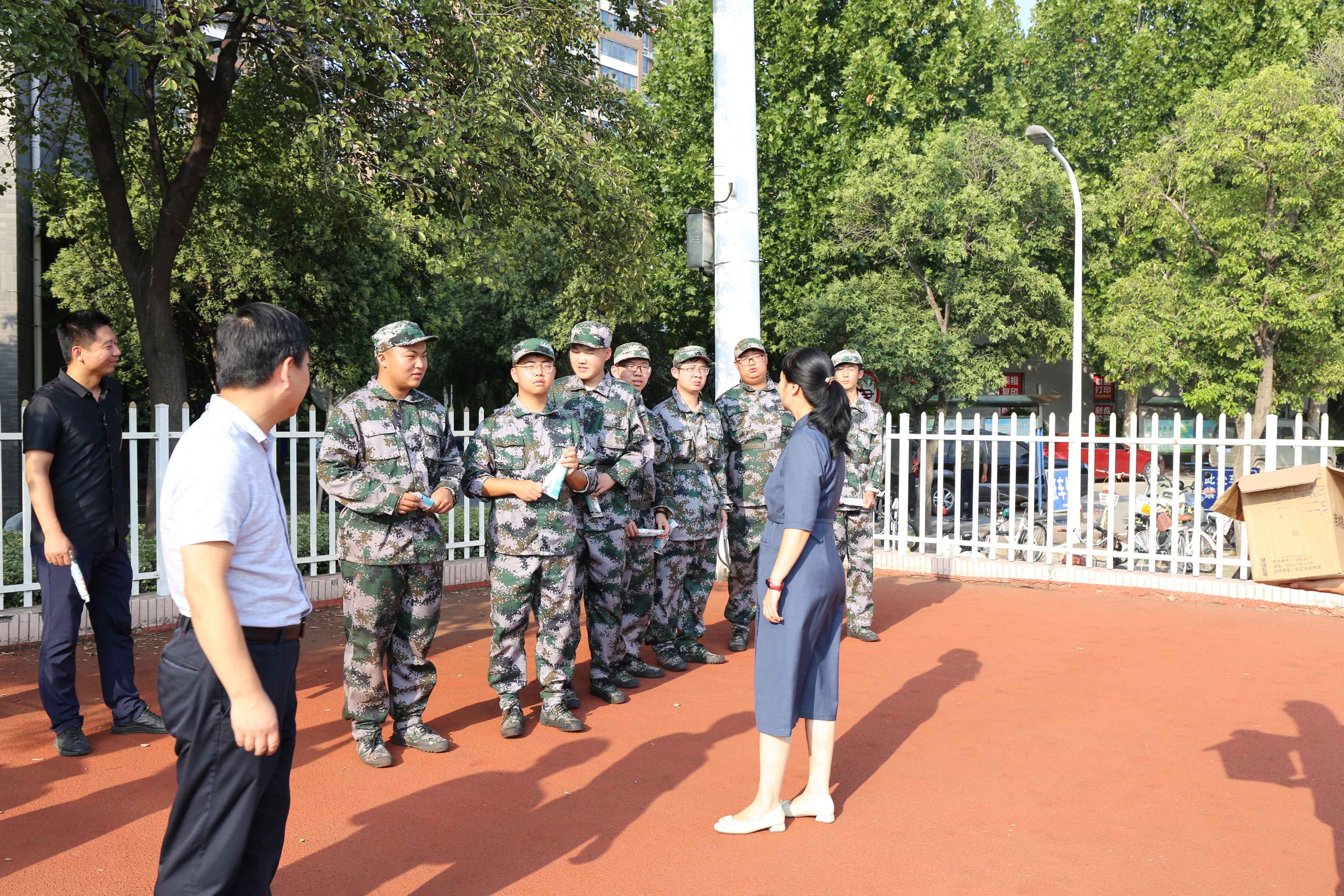 训练场上,身着迷彩服的小萌新们英姿飒爽。李夏慧首先代表学院对承训教官致以诚挚的感谢,高度肯定了学院参训学子不畏烈日、严循指令的精神品格,叮嘱同学们在训练中继续顽强拼搏、奋勇争先,用昂扬向上的精神风貌交出军训满意答卷。殷强高度赞扬了同学们吃苦耐劳的精神品格,他表示军训有助于磨练个人意志、提升综合素质,希望同学们把军训养成的优良作风贯穿整个大学生活,经风雨、见世面、壮筋骨、长才干,坚决服从教官指挥,不折不扣完成军训任务。