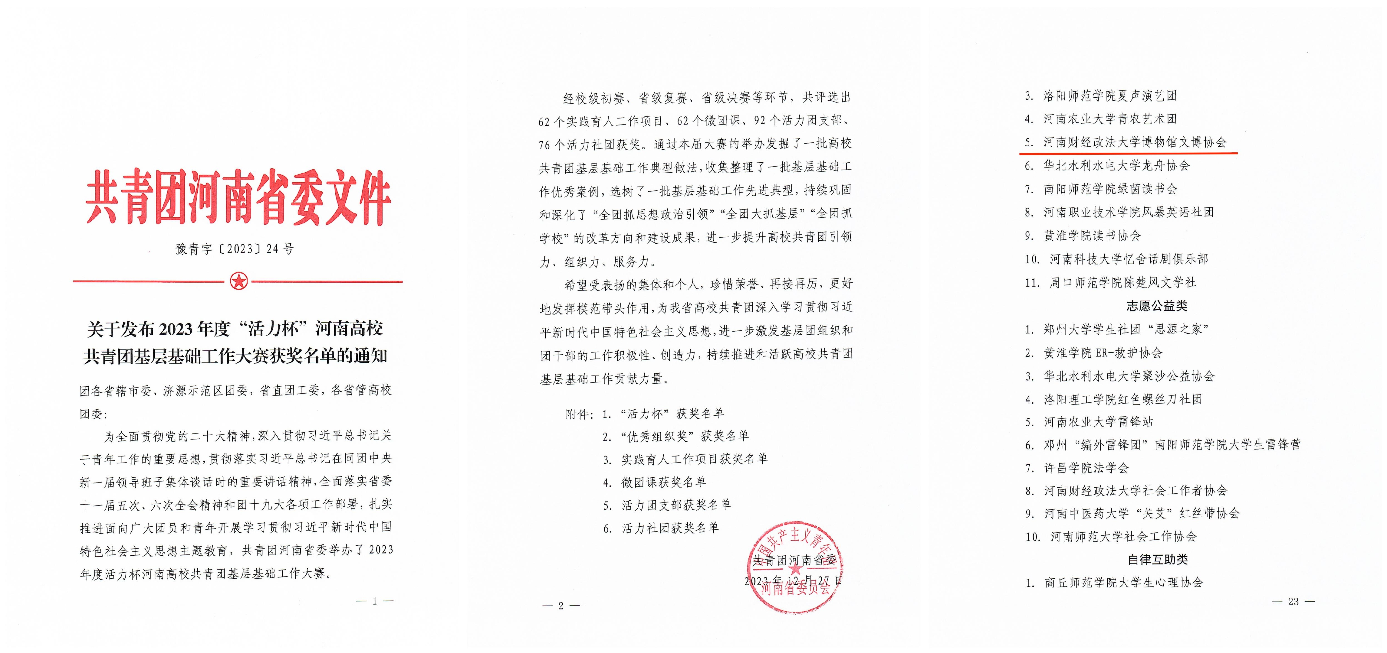 近日,由共青团河南省委主办的2023年度“活力杯”河南高校共青团基层基础工作大赛决赛在洛阳理工学院成功举办,我院文博协会获评河南省“活力社团”荣誉称号。