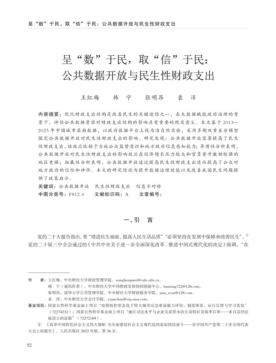 校友风采|王红梅,韩宁等:呈“数”于民,取“信”于民:公共数据开放与民生性财政支出