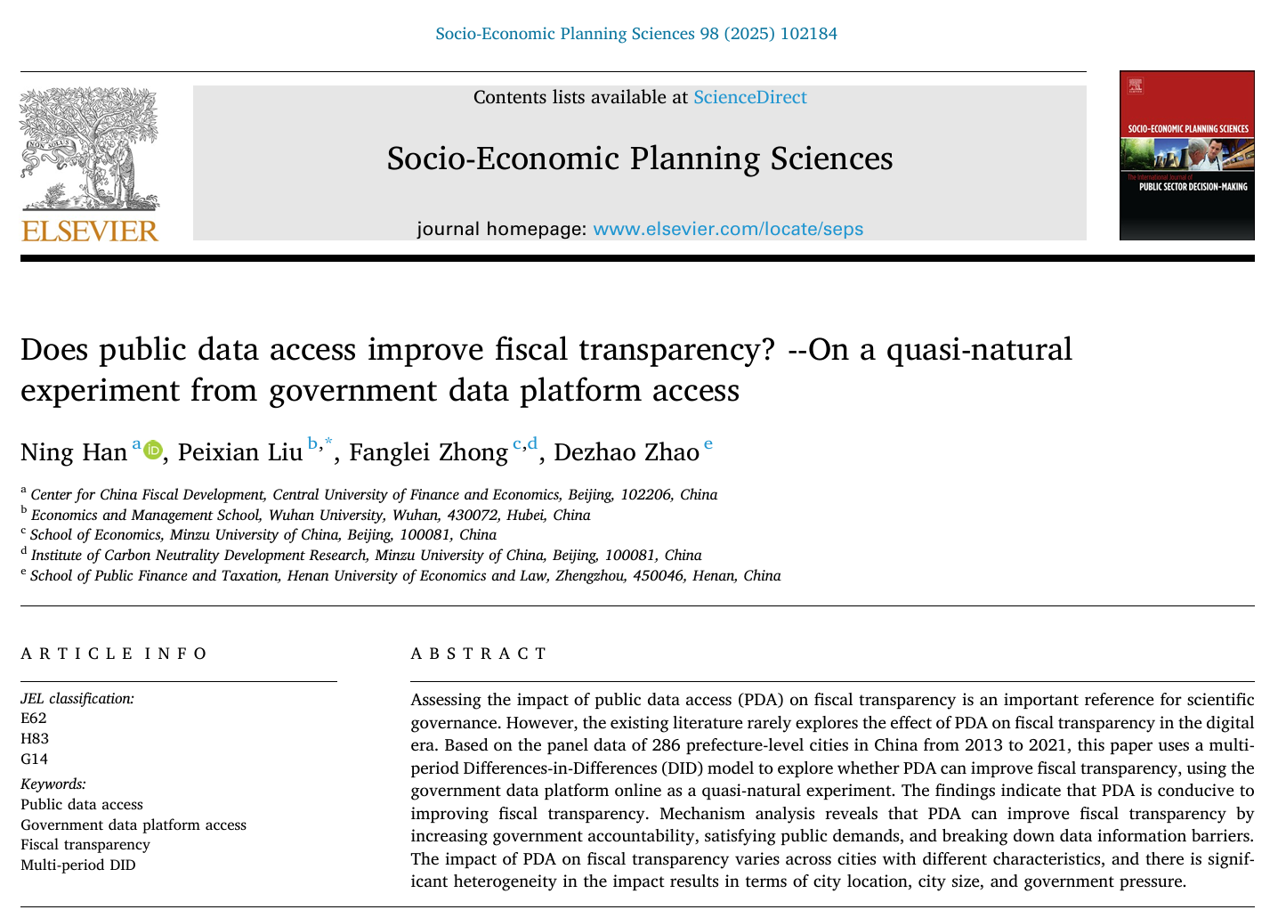 近期,中央财经大学中国财政发展协同创新中心博士生韩宁(系我院2023届财政学硕士生,硕士导师为赵德昭教授)与其合作者的最新研究成果《Does public data access improve fiscal transparency? --On a quasi-natural experiment from government data platform access》在《Socio-Economic Planning Sciences》第98卷正式发表。《Socio-Economic Planning Sciences》是Elsevier旗下经济学、运筹学与管理学研究领域的重要跨学科期刊,主要刊发内容涵盖公共政策、资源配置与可持续发展等前沿议题,被SSCI、SCI和Scopus数据库检索收录,现为JCR分区一区,中科院经济学一区TOP期刊。