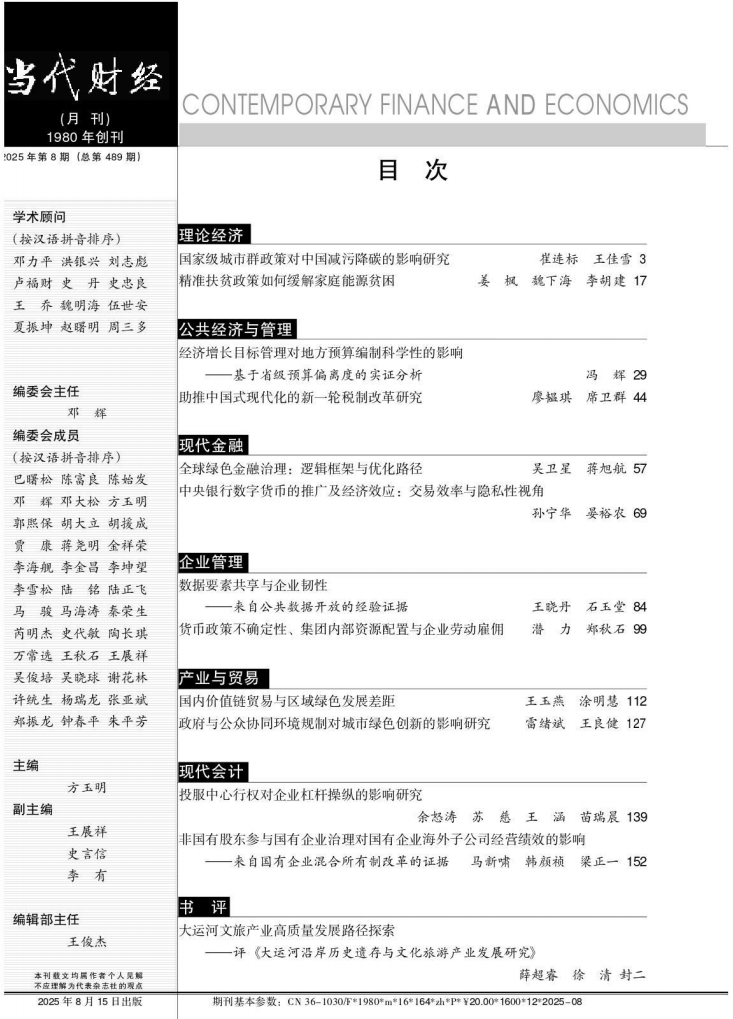 近期,我院冯辉老师最新研究成果《经济增长目标管理对地方预算编制科学性的影响—基于省级预算偏离度的实证分析》在《当代财经》2025年第8期正式发表。《当代财经》追随中国改革和发展的浪潮,秉承“求实、创新、争鸣、服务”的办刊宗旨,遵循“立足当代,服务财经”的办刊理念,从学理角度关注、研究当代社会经济生活中属于热点、重点、难点的经济与管理问题,追踪经济学与管理学的学术前沿。