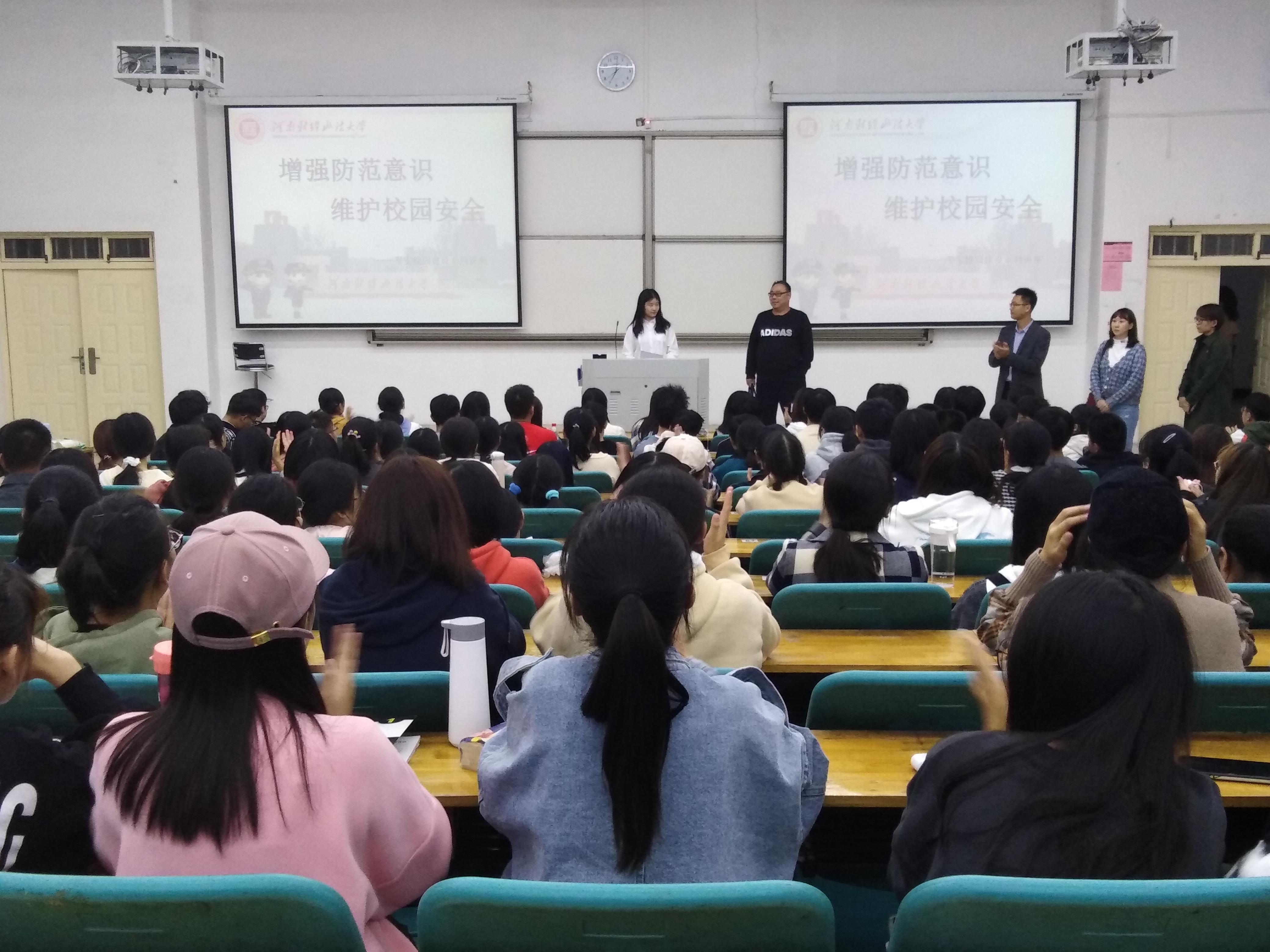 首先,魏保平对近年来省内大学生受骗数据做了简要分析,引起在座学生的高度重视。随后,他围绕防范电信诈骗、防范传销与毒品和维护消防安全等方面,向学生介绍当下的各种骗局,普及安全知识,提醒同学们注意保护个人信息和财产安全。期间,魏保平重点强调,近年来信息、网购、网贷等网络诈骗比率逐年提升,他以大学生受骗案例作为警示,告诫同学们要时刻保持警惕,切实保护好自己和他人的人身财产安全。最后,魏保平代表校保卫处表示会坚决维护同学们的切身利益,为同学们在校期间的人身财产安全尽可能提供保障。