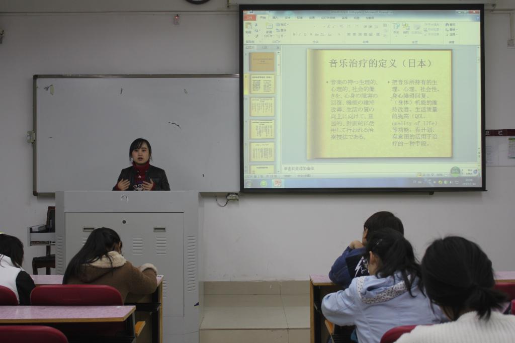 讲座伊始,马腾娇老师结合具体案例从音乐所持有的生理、心理、社会性、生活质量的提高等功能方面,对“音乐治疗”的定义做出详细解释,指出音乐治疗是有计划、有意图的适用于病理治疗的一种手段。接着,马老师主要从医学及心理学两个角度出发,介绍音乐治疗可以神奇地维持老年人的身体机能和改善大脑受到破坏的人的身体机能,并且作用效果显著。除此之外,马老师还通过介绍华盛顿音乐治疗博士的观点——音乐对脑产生的影响及可能性、以及五感刺激疗法推动脑内认知机能两个方面突出解释音乐与脑之间密切的联系,从而说明音乐治疗对病状的改善作用。最后,本院辅导员陈怡斐指出作为当代大学生,不能局限于精修自己的专业,要丰富自己的知识体系,全面发展,提升自己的综合能力。