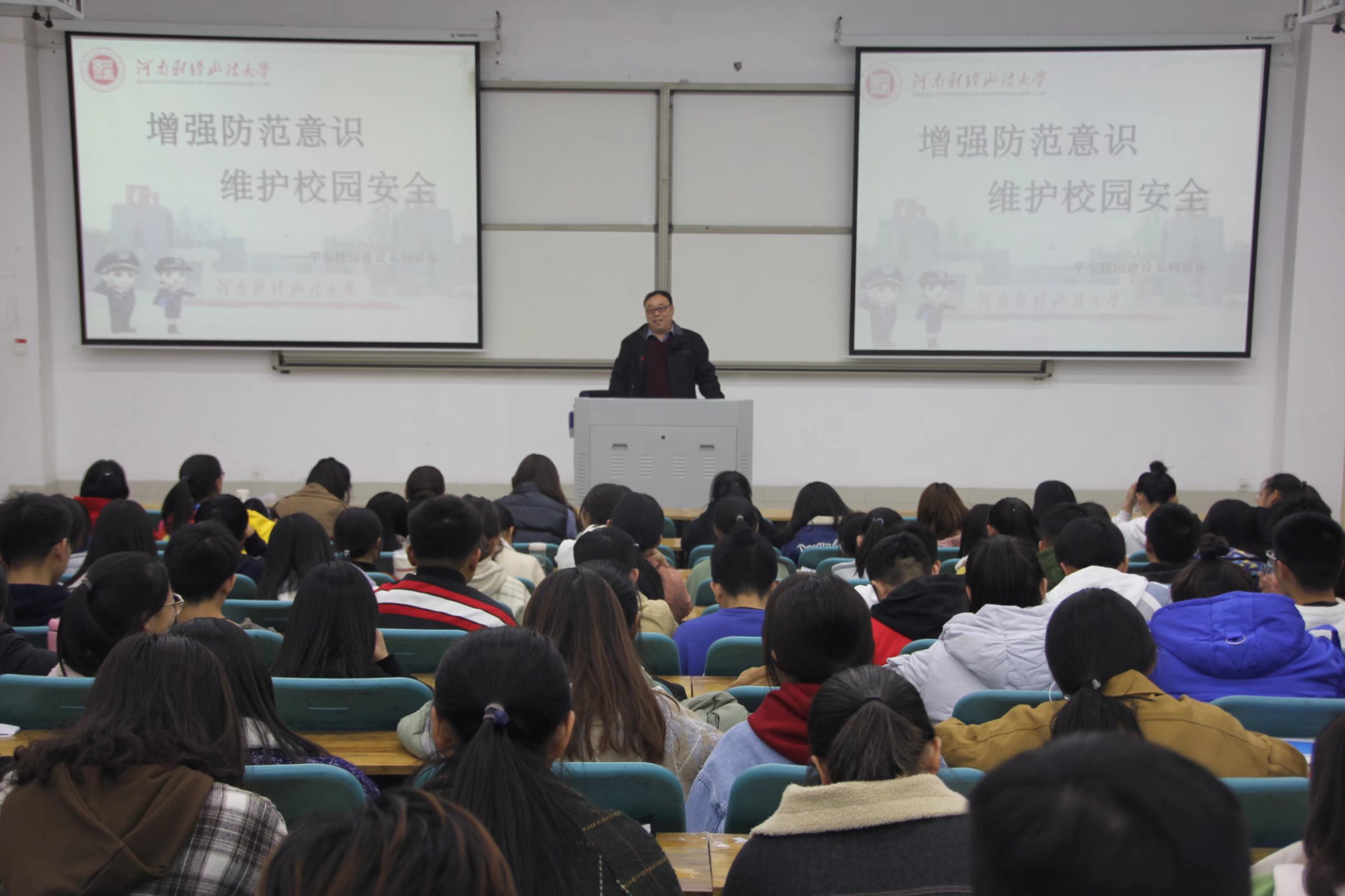 讲座中,魏保平从防范电信诈骗、维护消防安全、防范传销和毒品、维护网络安全严防宗教渗透四个方面向同学们进行安全知识普及。期间,他重点强调了提高安全意识的重要性,提醒同学们要时刻保持警惕,并结合近年来各大高校频发的安全事故典型,形象生动地向同学们诠释了,维护校园安全,人人有责,每个人都应该以实际行动,切实维护自己和他人的人身财产安全,防患于未然。最后,魏处长向同学们表示,校保卫处会坚决维护同学们的切身利益,为同学们学习生活提供保障,同时送上了对同学们的美好祝愿,赢得了同学们的阵阵掌声。