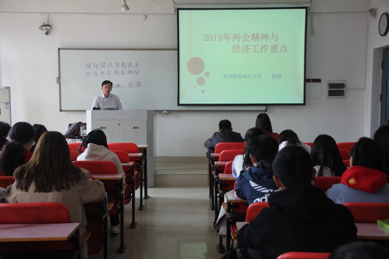 此次活动以“深化财税体制改革,把握两会政策动向”为主题展开。殷强向同学们介绍了两会的历史由来,并就两会的重要性加以具体阐述。同时,他表示作为财税专业的学生,应及时关注两会动向,关于两会中深化财税体制改革的问题应予以重点关注。随后,殷强分析了两会思想,就此次两会提出了自己的看法并引导同学们积极思考。