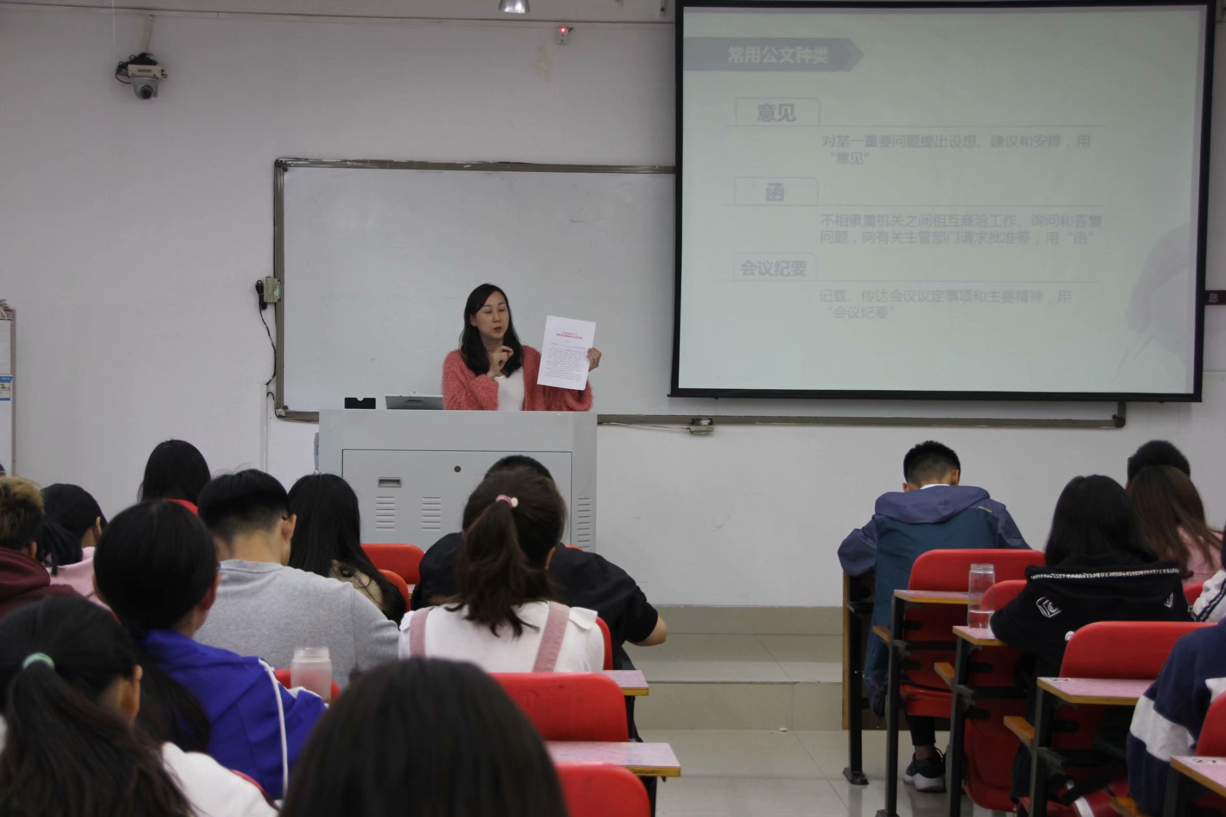 在会上,张岚岚老师主要就“常用行政公文写作技巧”展开讲解。在会议开始时,张老师用“以学生会的名义向学校借三顶帐篷”的问题让副部写申请书。接着,她就申请书上所看到的问题提出建议,并用简洁明了的PPT向副部们展示了公文写作基础知识、公文写作与处理的相关知识,并就部分公文实例进行讲解。张老师幽默风趣的话语使得会议气氛十分活跃,各部门副部受益匪浅。