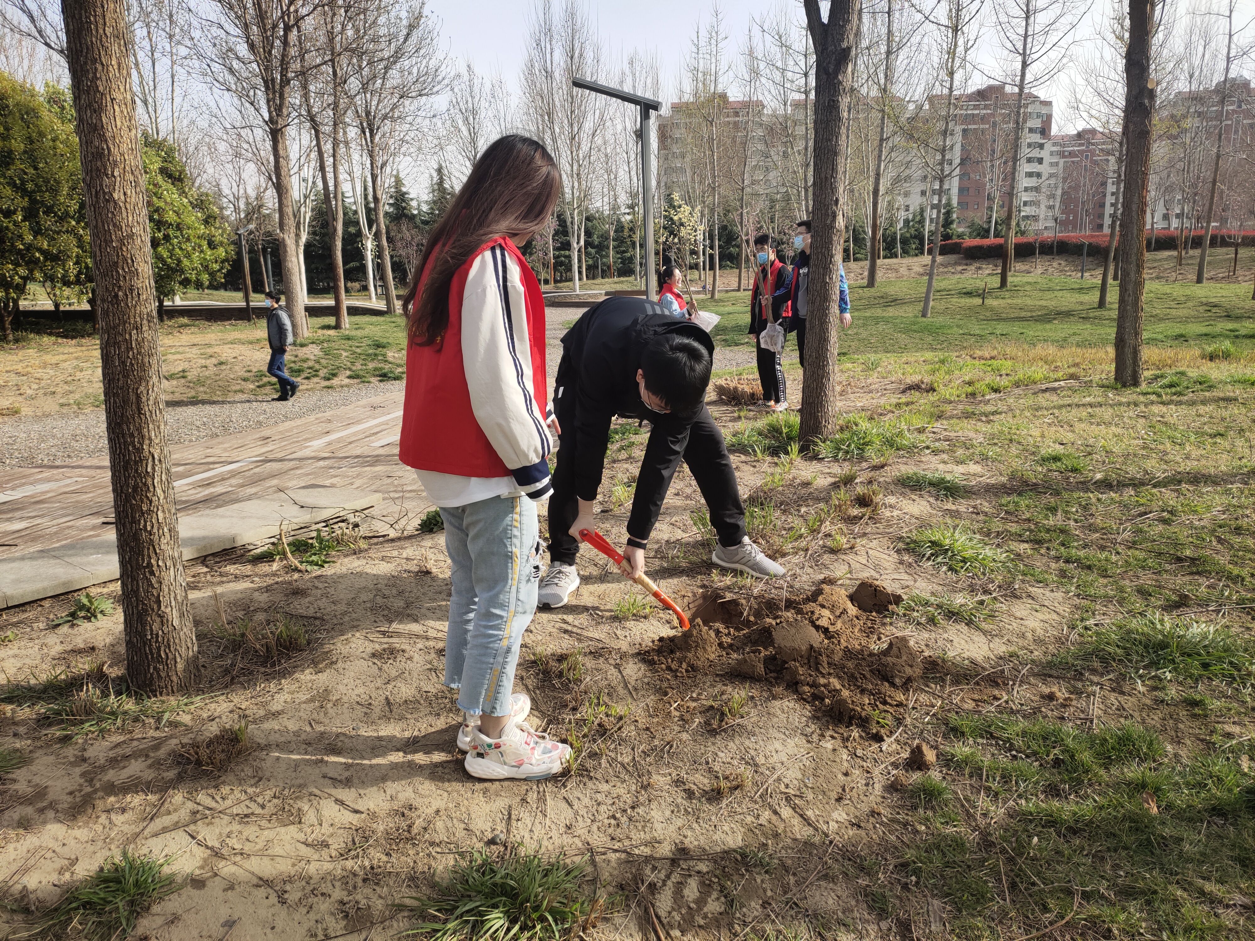 准备阶段,志愿者进行合理分组,以高质量、高效率完成后续工作。活动进行时,小组成员分工明确,扶树、培土、夯实,相互协作,严格按照植树的要求和标准,认真完成每一道工序,大家热情高涨,干劲十足,充分体验了植树的成就感和幸福感。在大家的通力协作下,一株株树苗迎风挺立,展示出勃勃生机的景象,志愿者给树苗命名,赋予本次植树活动以深刻的意义。