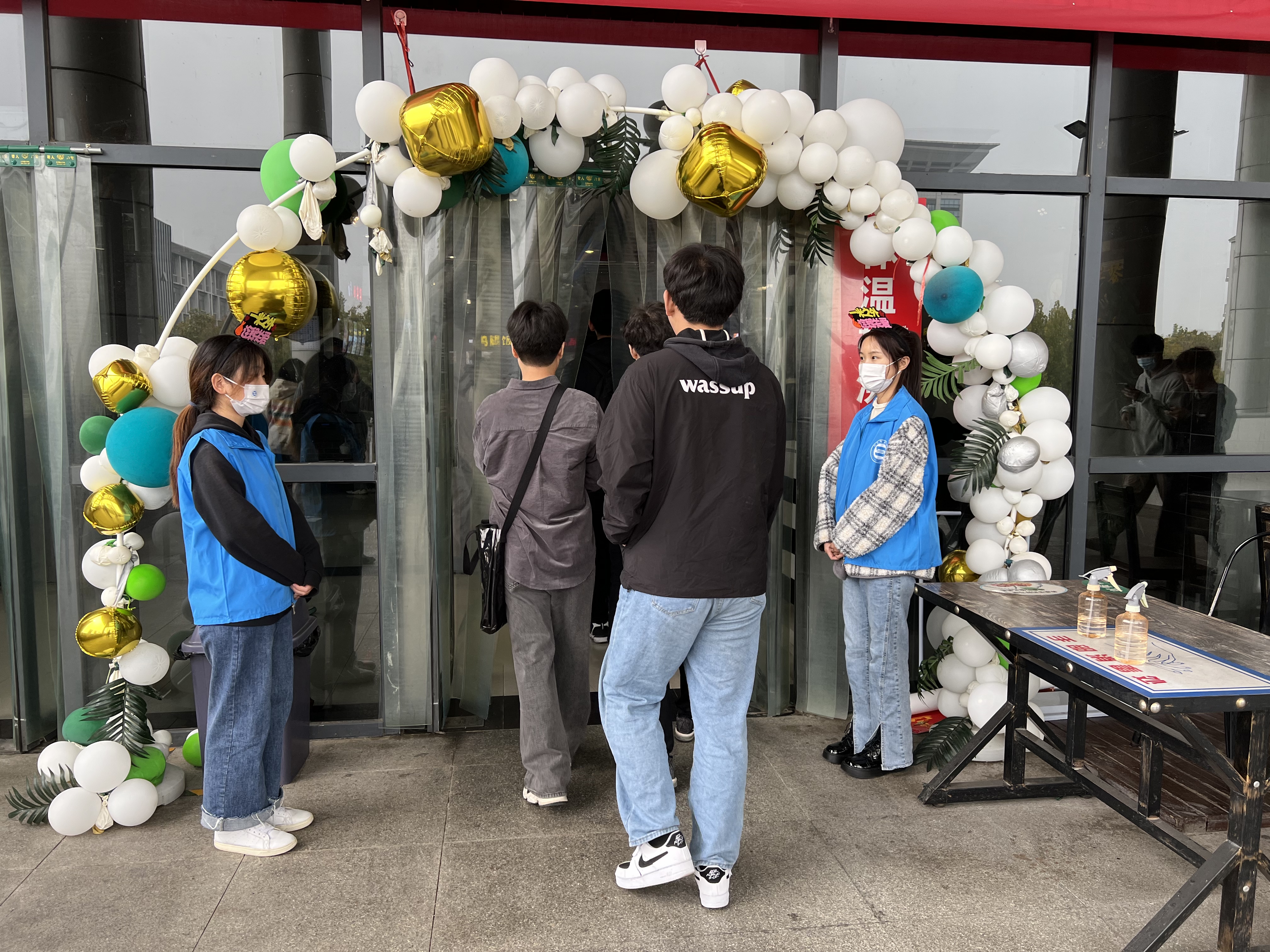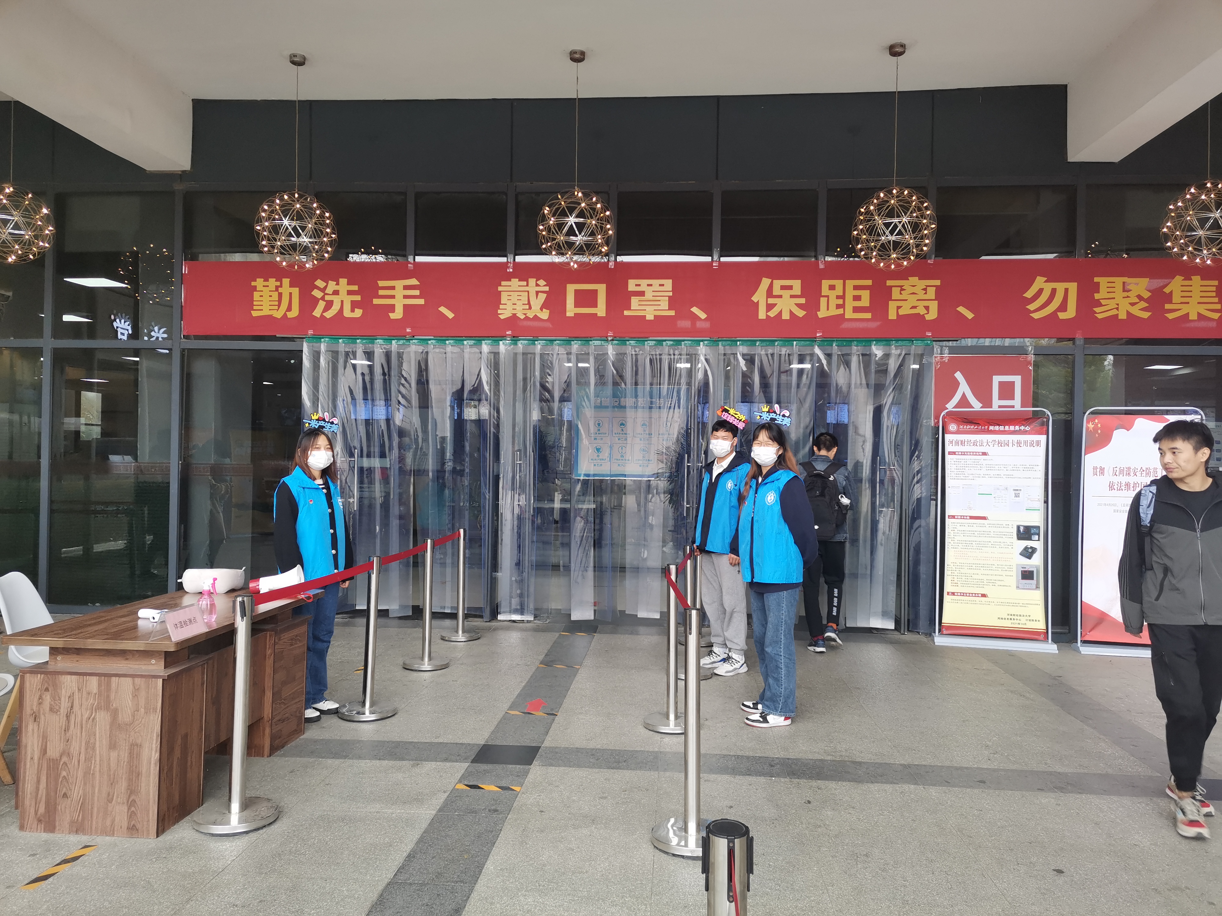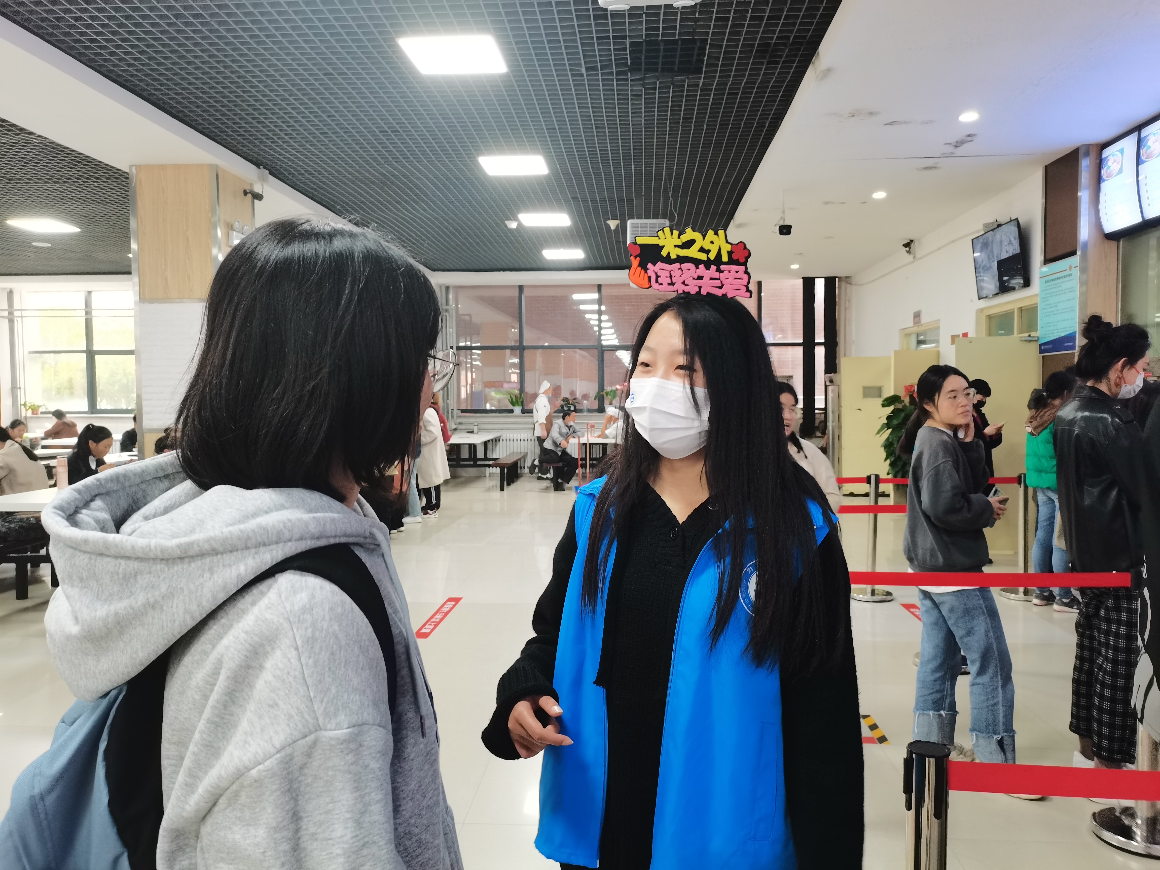 中午11点30分,志愿者已全部就位,负责协助餐厅进行疫情防控管理,要求就餐人员佩戴口罩,在等餐排队时保持适当距离,提醒大家就餐时尽量不聚集,鼓励使用自带餐具,倡导打包回宿舍就餐等,确保食堂就餐环境文明有序。