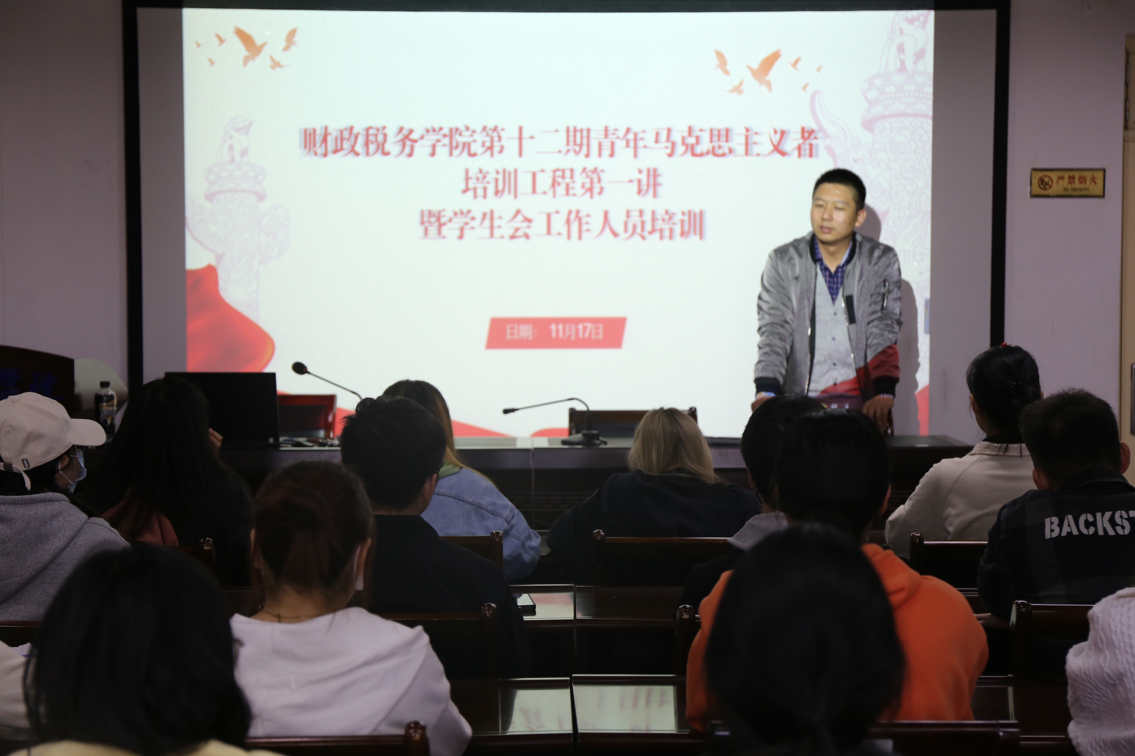2021年11月17日中午13:00,williamhill英国于教学科研楼555教室召开学生干部培训会,williamhill英国辅导员宋鑫磊主讲,21级团学组织各部门工作人员积极参与。