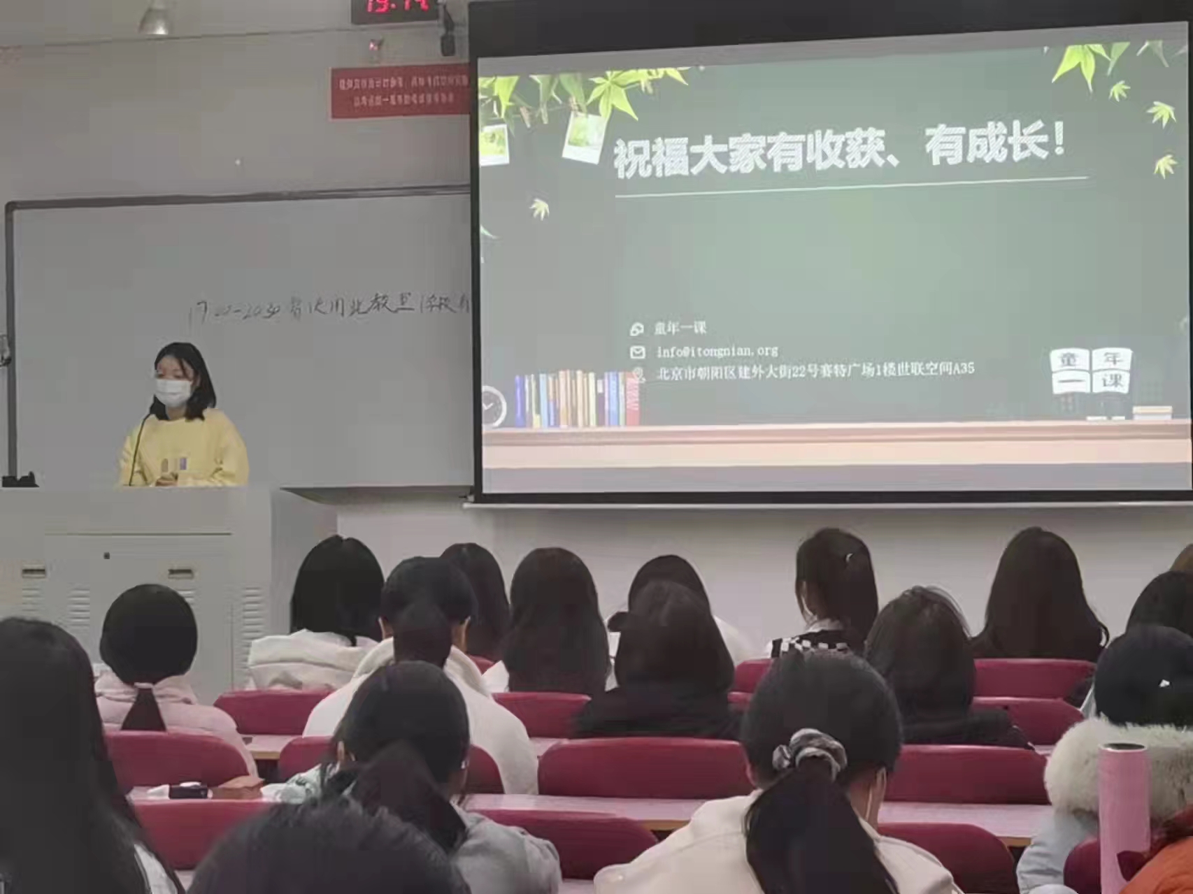 活动前期,活动负责人召开专题会议,制作宣传海报并开设咨询点,答疑解惑的同时收集报名材料,线上线下多渠道宣传,为活动顺利开展营造了良好的氛围。宣讲会上,主讲人详细介绍了活动平台、活动内容和具体开展形式,“童年一课”云教室项目是由机构、小学和志愿者(个人或团队)三方共同推进的项目,旨在通过线上一对一直播授课的方式改善乡村小学师资匮乏、课程单一的现状,同时降低长期支教参与门槛,使志愿者在不影响正常工作及生活的情况下实现为乡村学生长期授课的愿望。讲解完毕后,负责人耐心回答与会同学提出的问题,同学们热情高涨,纷纷表示对本次活动充满期待。