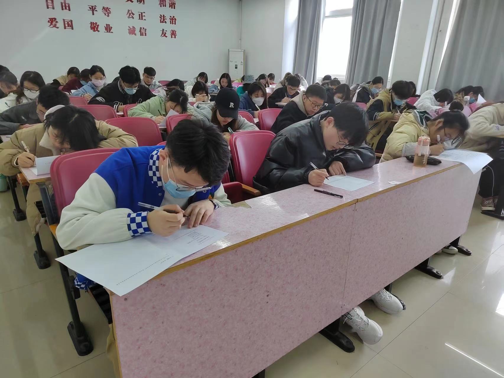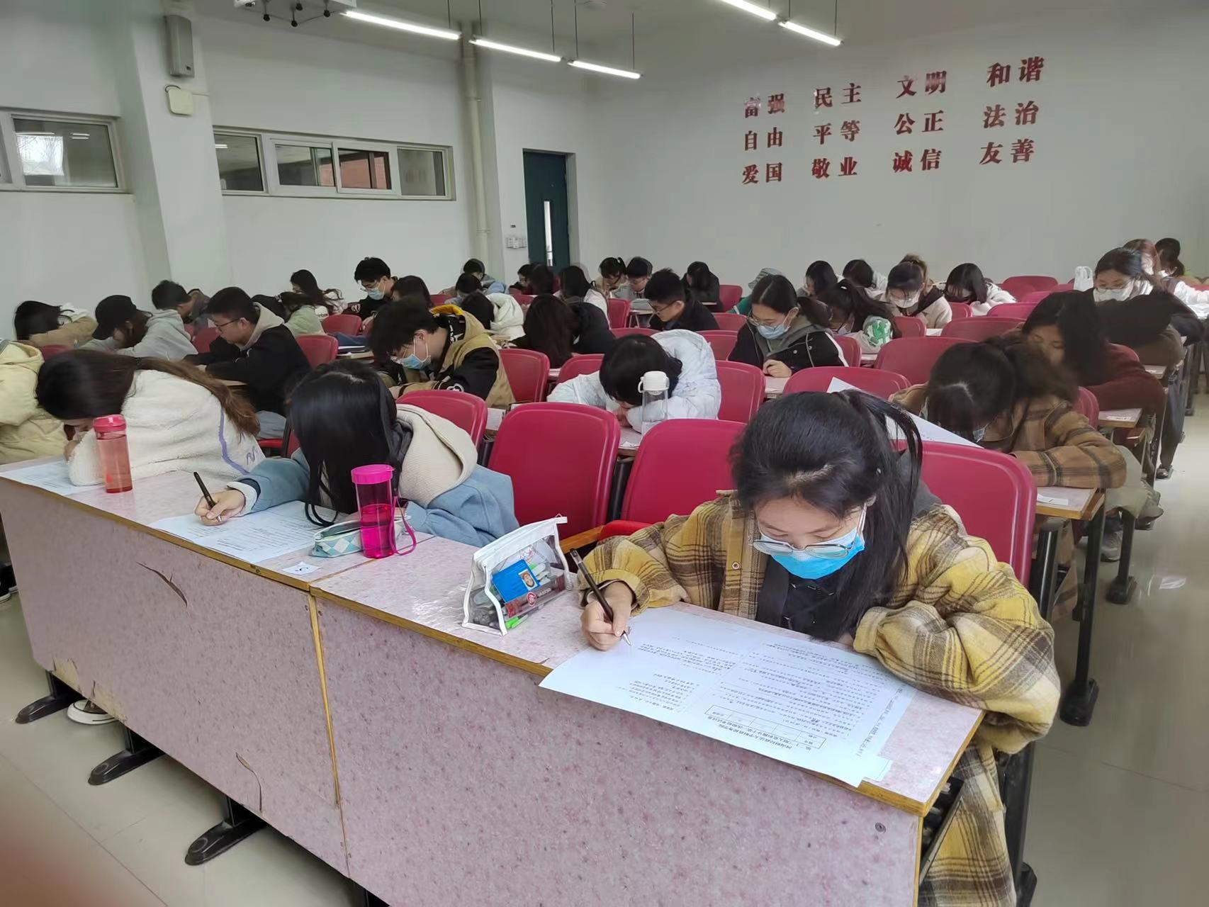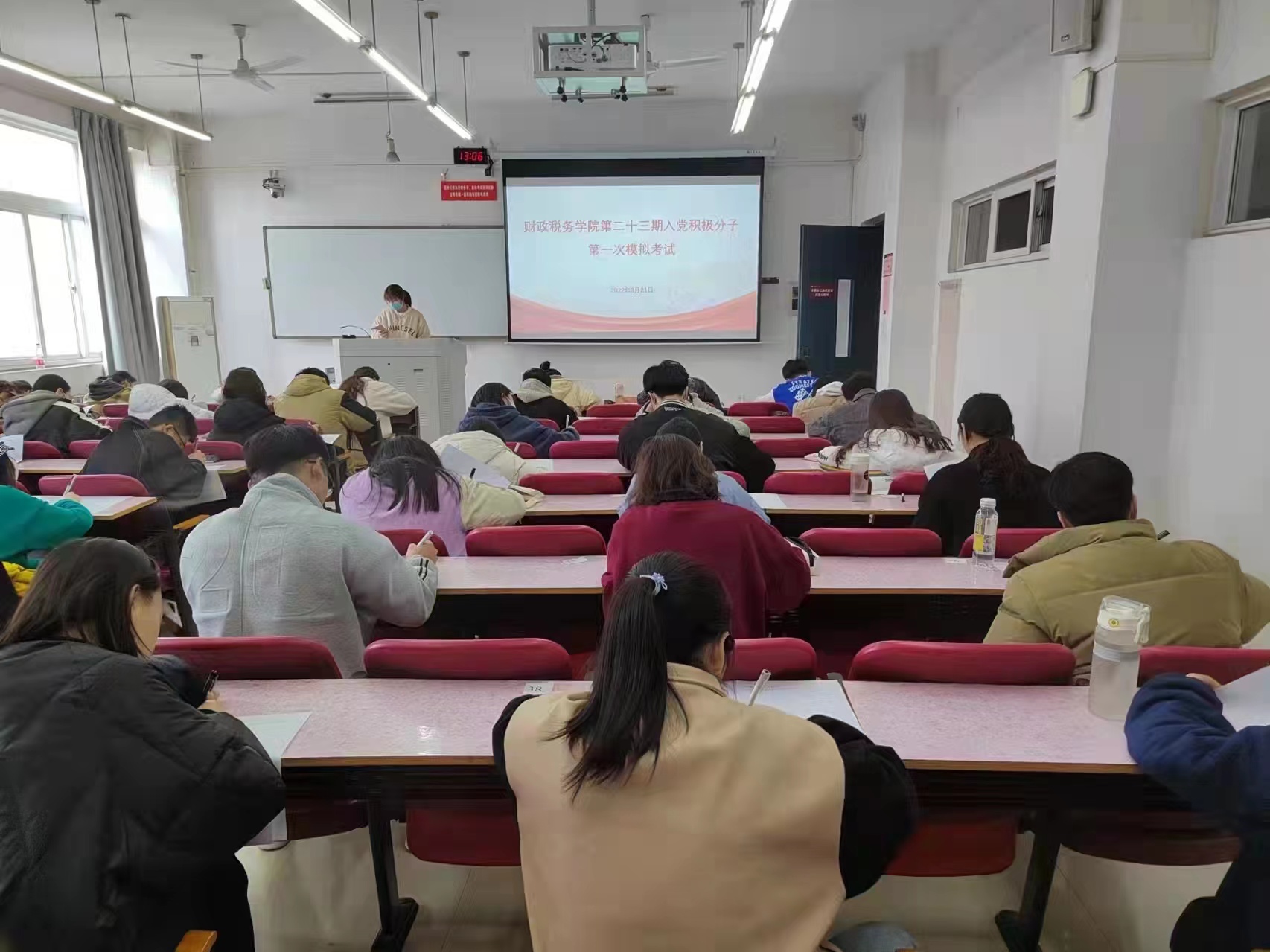 本次模拟考试以党章为基础,结合十九届六中全会等时政热点,多方位考察入党积极分子的政治理论水平以及对国家时政的掌握情况。考试过程中,监考人员严格监督,严肃考场纪律,考生积极作答,诚实守信,考场秩序井然。