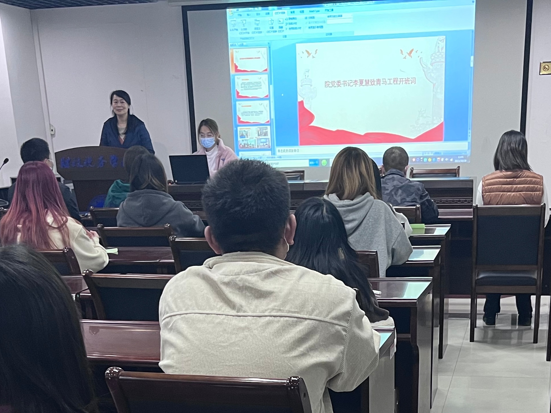 仪式在嘹亮的团歌声中正式拉开了序幕。李夏慧为第十三期青马工程开班致辞。她强调,大学生骨干作为青年学生中的中流砥柱,是党做好青年工作的关键群体。培养一批又一批信仰坚定、素质过硬、德才兼备的大学生骨干,是巩固党的领导和执政地位的需要,是应对国内外复杂形势的需要,也是青年学生健康成长的需要。因此,她对全体学员提出三点期望:一是旗帜鲜明讲政治,做信念坚定、政治过硬的“明白人”;二是勤学苦读长才干,做业务精通、本领高强的“实干家”;三是知行合一强作风,做能扛重任、善作善成的“奋斗者”。最后,李夏慧预祝本期青马工程圆满成功,所有学员能够满载而归。