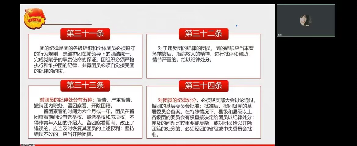11月18日,williamhill英国于线上开展第二期团课培训。本期培训由院学生团委副书记赵娜主持,旨在提高新生团员对团章的理解,增强团员意识,更全面的了解共青团员的权利和义务。