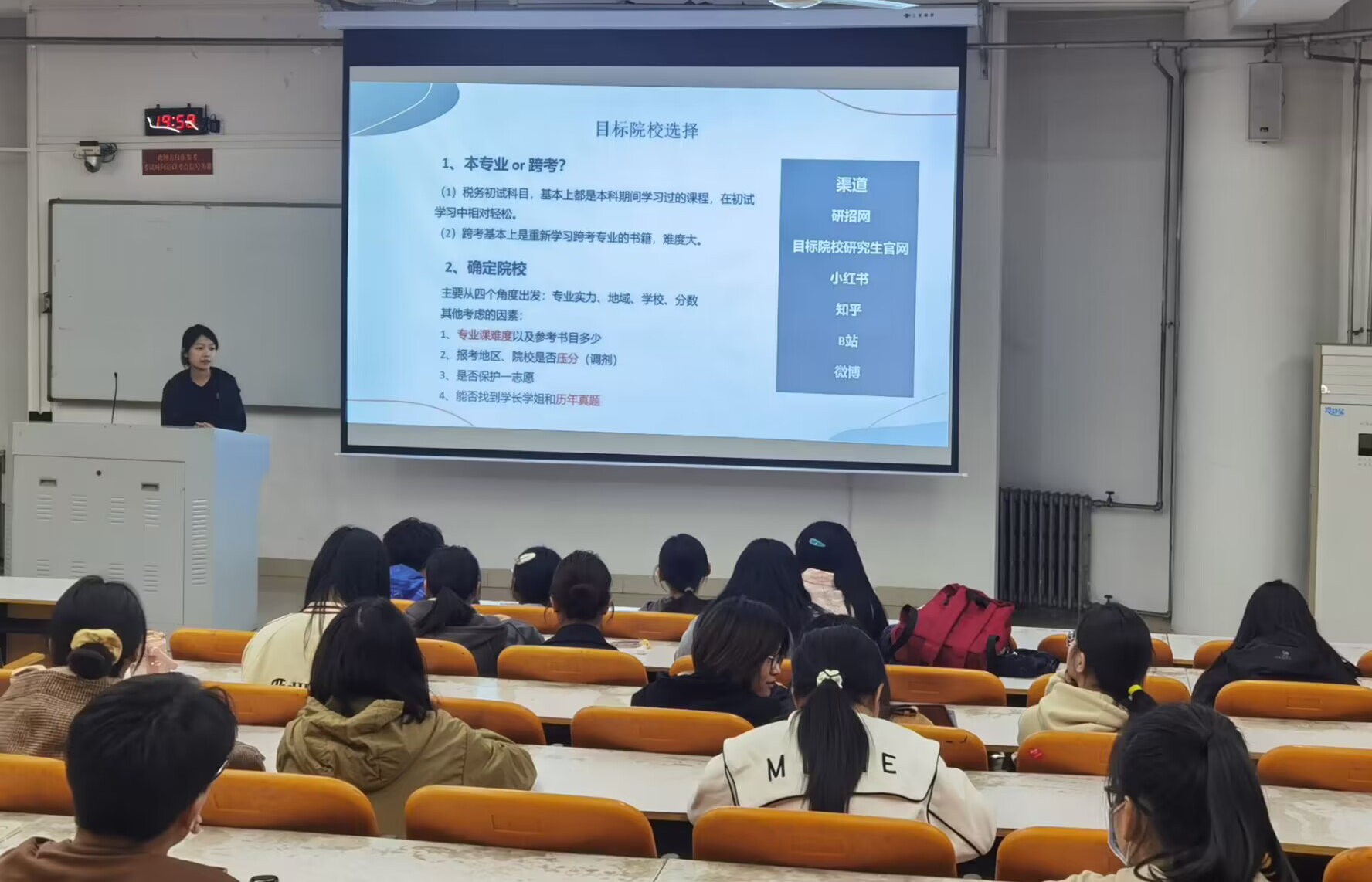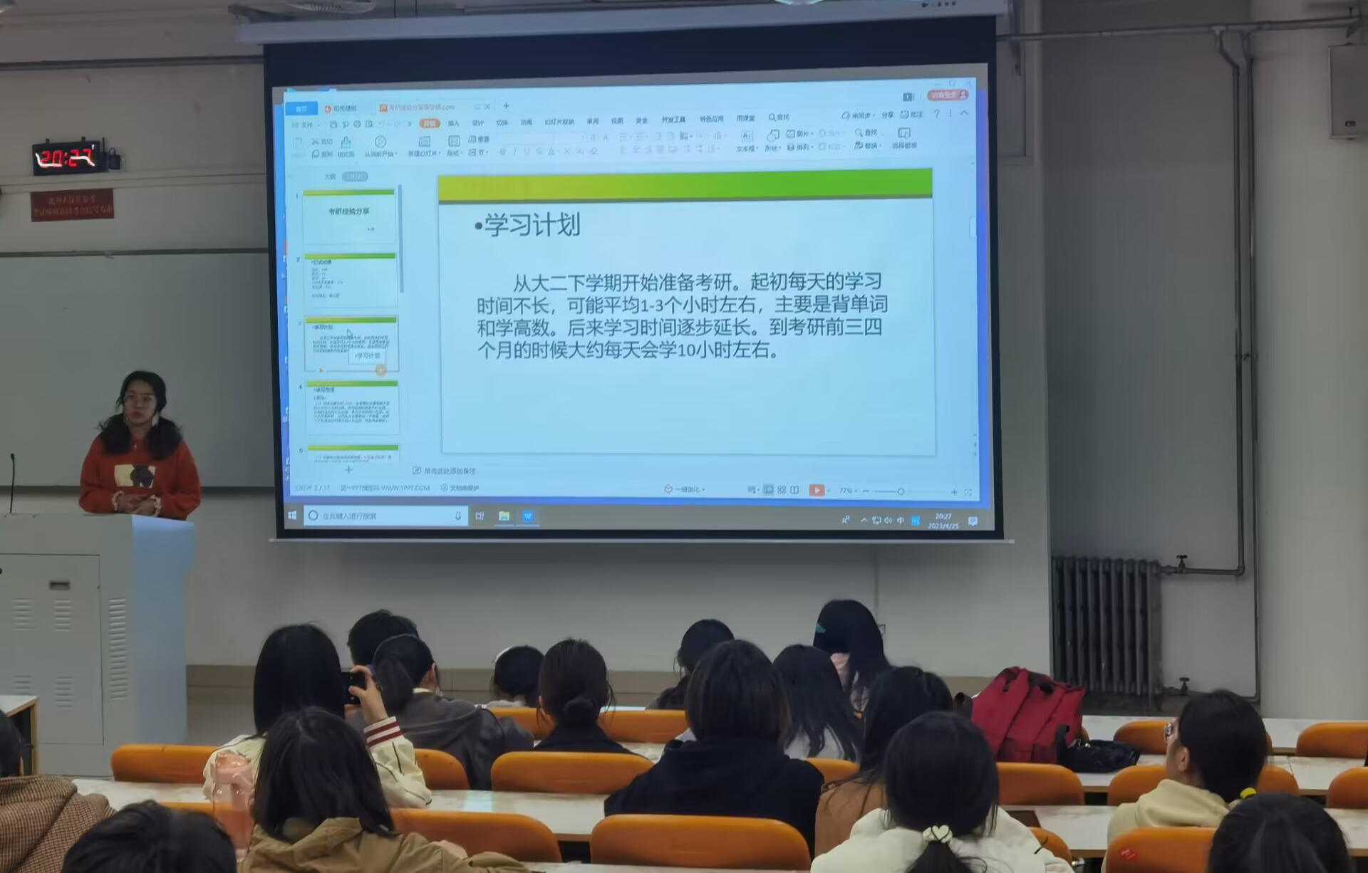 接着,刘增锐带领同学们回顾近几年的考研分数线,分析就业前景,引导同学们对考研进行更深层次的思考。通过列举身边不同状态下考研同学的实际案例,告诉大家不盲目复制别人的规律,找到适合自己的复习方法后全力以赴,并在最后分享了自己的考研书单及备考实用技巧。