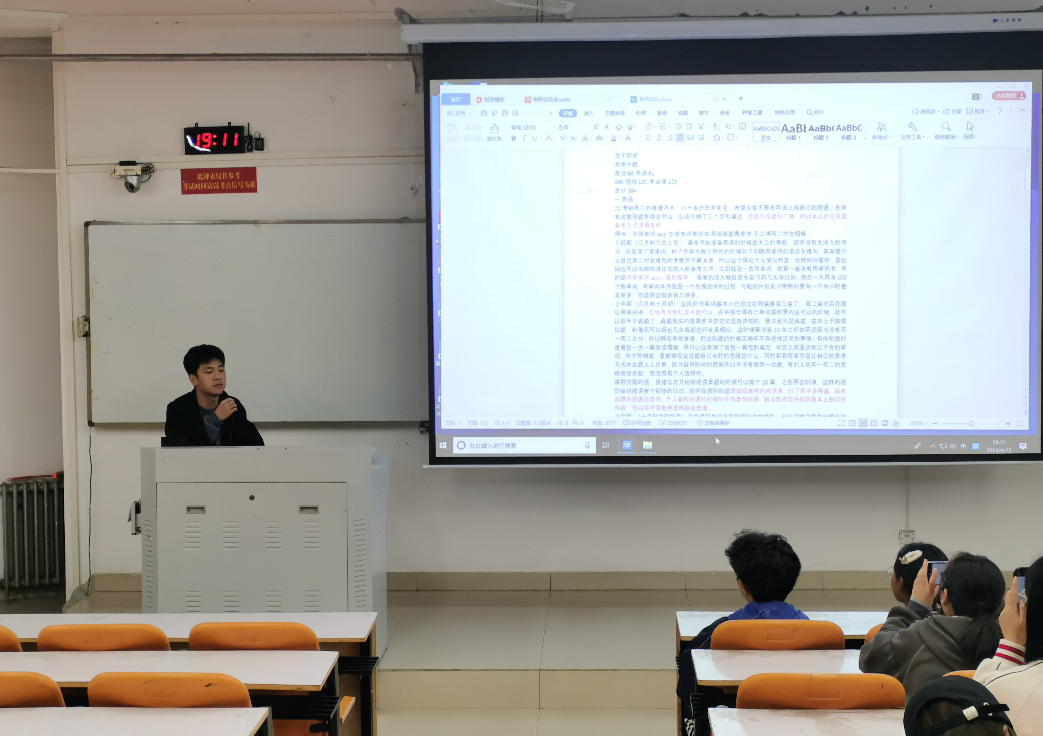 随后,王新悦详细介绍了自己的备考计划,提醒同学们合理规划复习时间,突出强调了夯实专业知识基础、真题演练的重要性。她提到,要根据不同学科的特点制定复习计划,政治复习要做到“战略上藐视,战术上重视”,而英语复习则要做好整块时间与碎片化时间的充分利用,在稳扎稳打、循序渐进中实现稳步提升。