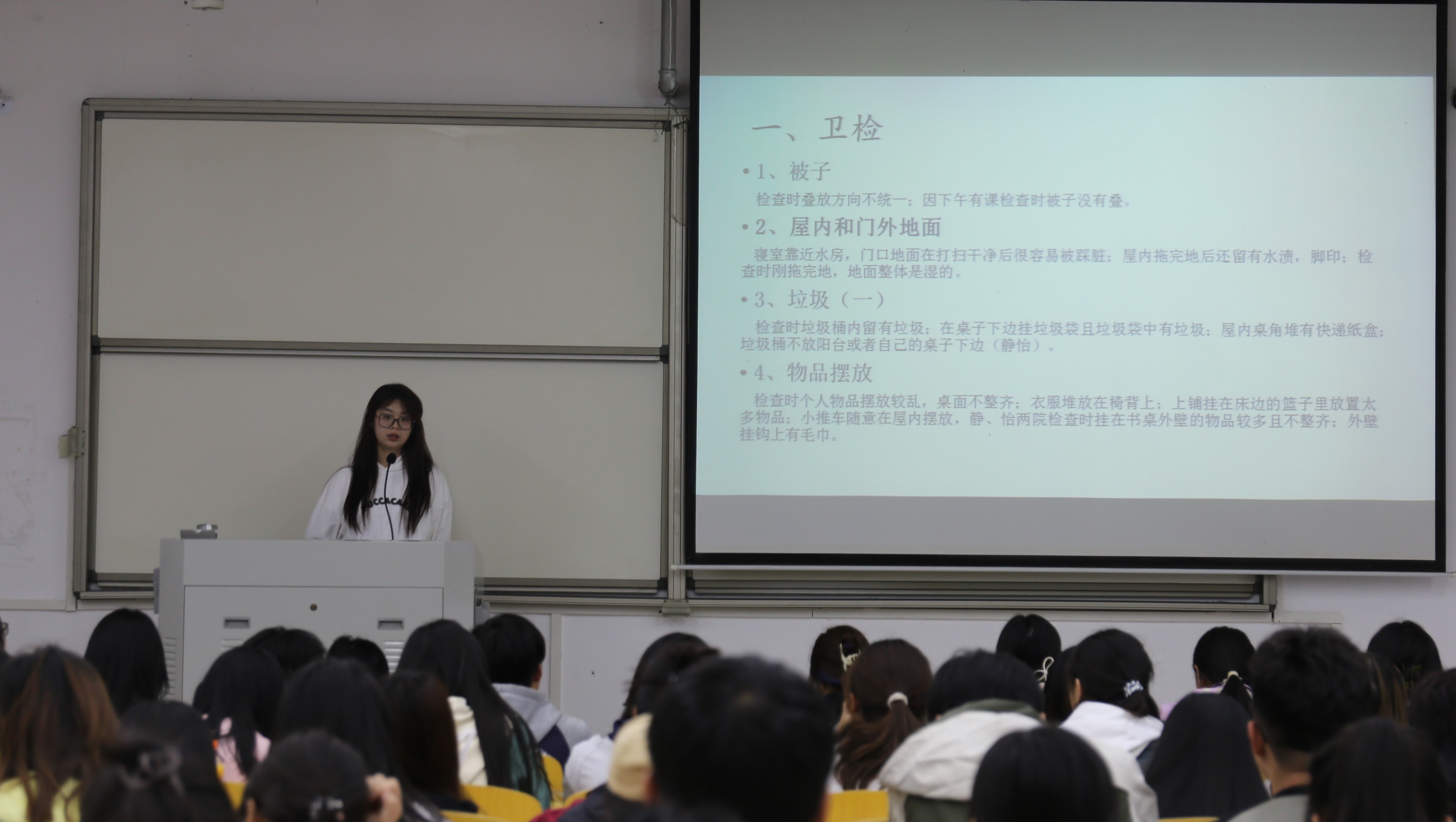 会上,孟戈围绕消防安全、宿舍安全、防火防骗等方面展开讲解,强调秋冬是安全事故多发季,严禁在宿舍吸烟,不使用违规电器,自觉养成良好行为习惯,严守校规校纪,共同营造平安和谐整洁的宿舍生活环境。同时,针对网络安全,孟戈结合各类网络诈骗案例,细致分析了日常生活中的安全隐患,为同学们敲响了安全的警钟,使同学们对信息时代各类网络诈骗形式有了清晰的认识,熟悉应对网络诈骗的方式方法,将“心中无贪念,骗局远身边”牢记于心。最后,就近期安全卫生检查工作存在的问题,孟戈向同学们做出详细说明,再次强调了三检工作的必要性,希望全体同学积极配合工作,共同构建平安和谐校园。