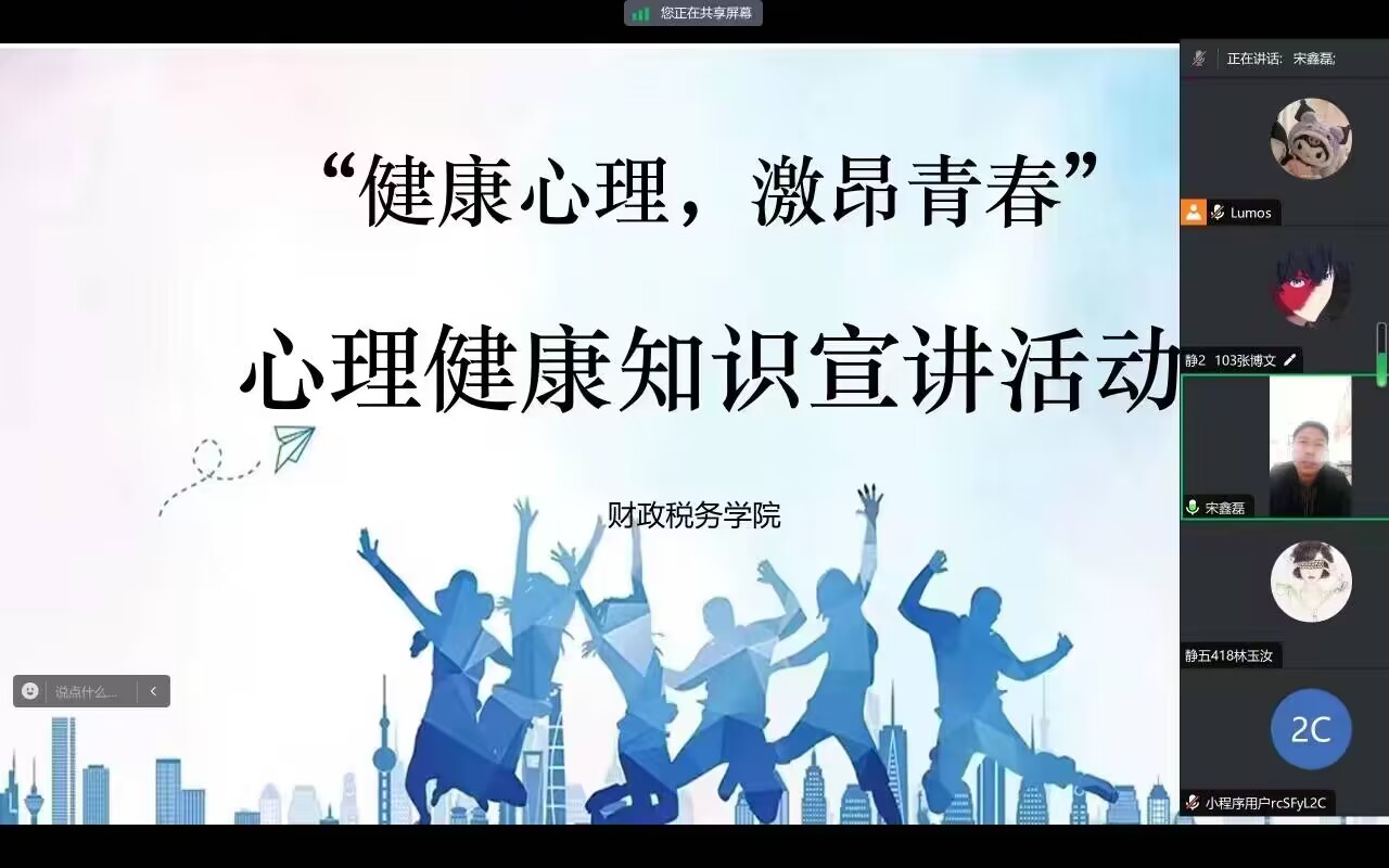 为提高学生对心理健康的认识和理解,增强自我保护和自我调节能力,11月27日,williamhill英国开展以“健康心理,激昂青春”为主题的心理健康教育宣讲活动。本次宣讲采取线上会议方式进行,心理辅导站站长宋鑫磊为主讲人,各班心理委员和寝室长参加。