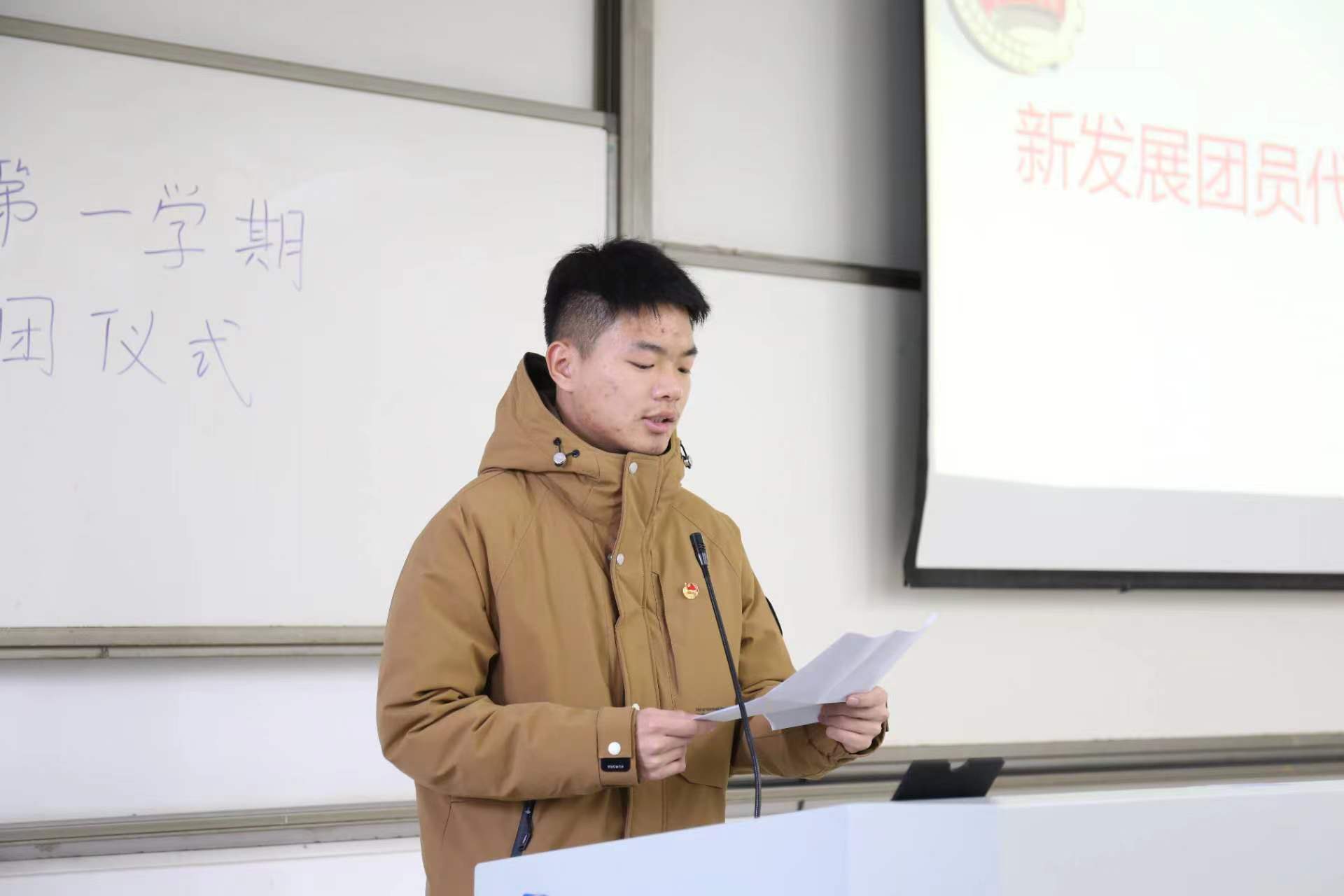 入团仪式在庄严的国歌声中拉开帷幕。学生团委副书记姚雨宣读新团员名单,宣布李少谍、周子豪等17名同学光荣地成为了中国共产主义青年团的一员,并邀请老团员上台为新团员佩戴团徽。随后由张岚岚带领大家进行入团宣誓,全体新团员端正肃立,紧握右拳,以饱满的热情向团组织坚定承诺为共产主义事业而奋斗的决心。誓言铮铮,回荡在整个会场,激荡在每位新团员心中。宣誓结束后,学生团委副书记冯苏坤宣读《团章》中有关团员权利和义务的部分,带领新团员进一步明确了今后的努力方向。