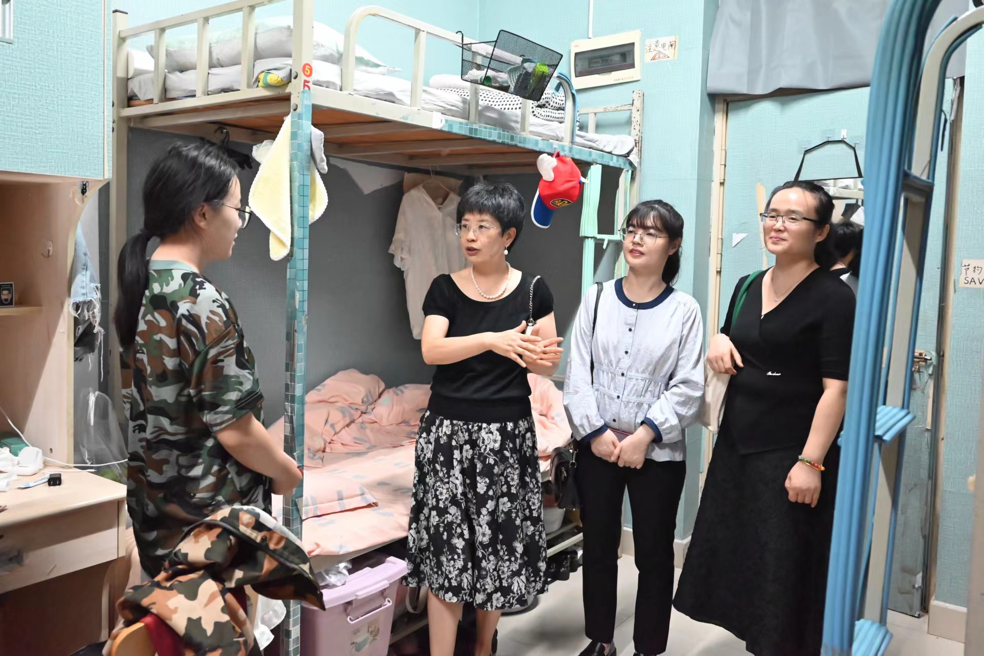 在走访宿舍的过程中,郝秀琴询问了大家入校后的住宿和生活保障情况,并耐心解答了新生提出的问题。梁长来与同学们进行了亲切的交流,了解同学们来校后的感受、对学校的印象等,并勉励同学们共同建立良好的宿舍环境和融洽的宿舍关系。