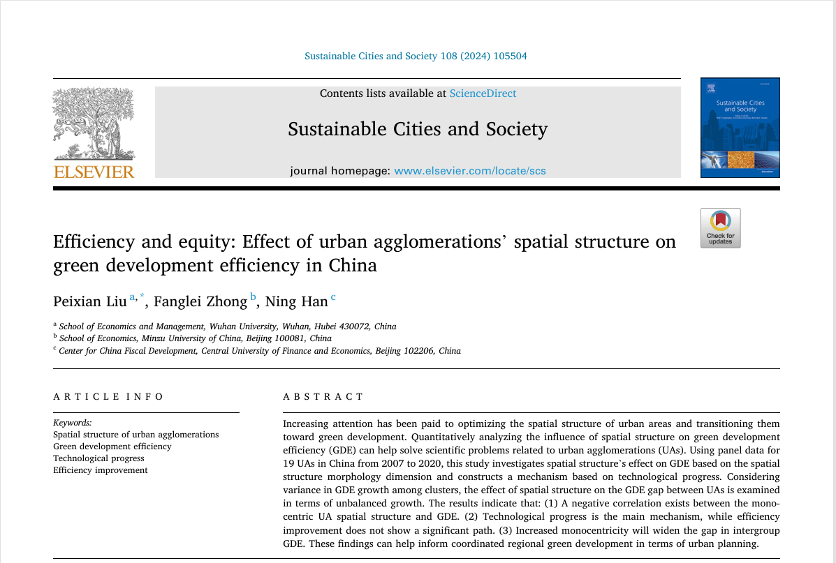 校友风采|刘培贤等:Efficiency and equity: Effect of urban agglomerations’ spatial structure on green development efficiency in China